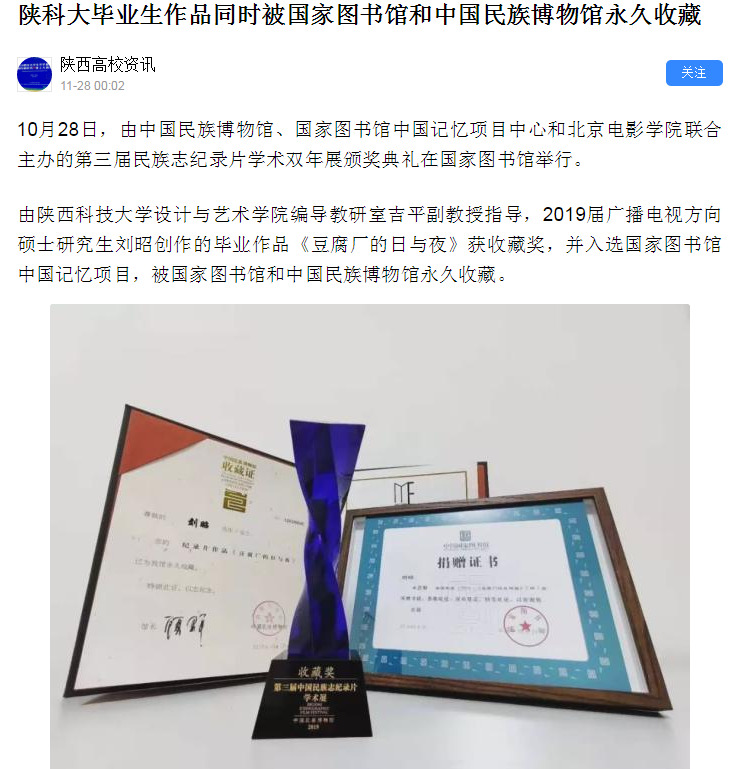 由陜西科技大學(xué)設(shè)計與藝術(shù)學(xué)院編導(dǎo)教研室吉平副教授指導(dǎo),2019屆廣播電視方向碩士研究生劉昭創(chuàng)作的畢業(yè)作品《豆腐廠的日與夜》獲收藏獎,并入選國家圖書館中國記憶項目,被國家圖書館和中國民族博物館永久收藏。