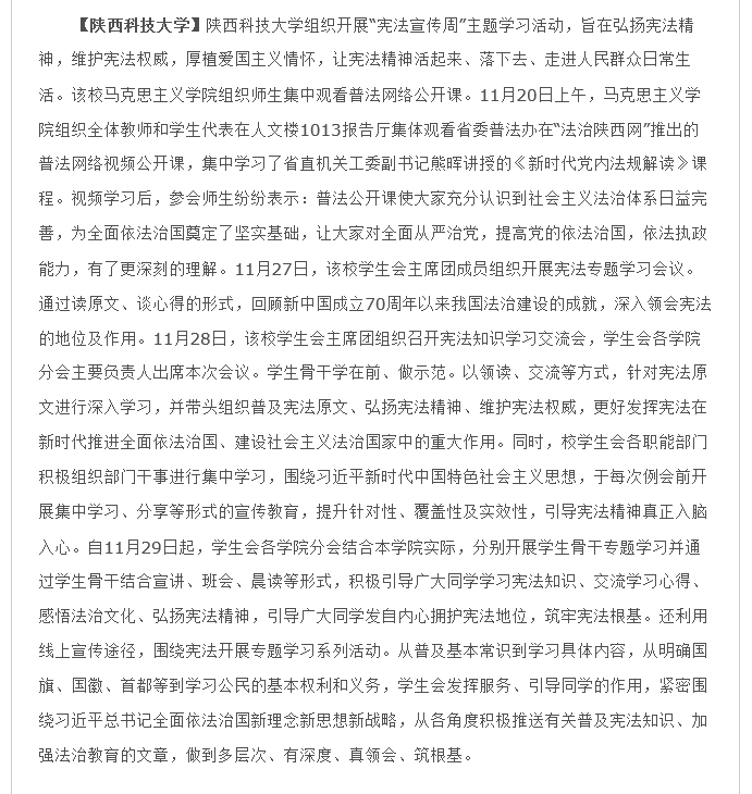 【陜西科技大學(xué)】陜西科技大學(xué)組織開(kāi)展“憲法宣傳周”主題學(xué)習(xí)活動(dòng),旨在弘揚(yáng)憲法精神,維護(hù)憲法權(quán)威,厚植愛(ài)國(guó)主義情懷,讓?xiě)椃ň窕钇饋?lái)、落下去、走進(jìn)人民群眾日常生活。該校馬克思主義學(xué)院組織師生集中觀看普法網(wǎng)絡(luò)公開(kāi)課。11月20日上午,馬克思主義學(xué)院組織全體教師和學(xué)生代表在人文樓1013報(bào)告廳集體觀看省委普法辦在“法治陜西網(wǎng)”推出的普法網(wǎng)絡(luò)視頻公開(kāi)課,集中學(xué)習(xí)了省直機(jī)關(guān)工委副書(shū)記熊暉講授的《新時(shí)代黨內(nèi)法規(guī)解讀》課程。視頻學(xué)習(xí)后,參會(huì)師生紛紛表示:普法公開(kāi)課使大家充分認(rèn)識(shí)到社會(huì)主義法治體系日益完善,為全面依法治國(guó)奠定了堅(jiān)實(shí)基礎(chǔ),讓大家對(duì)全面從嚴(yán)治黨,提高黨的依法治國(guó),依法執(zhí)政能力,有了更深刻的理解。11月27日,該校學(xué)生會(huì)主席團(tuán)成員組織開(kāi)展憲法專(zhuān)題學(xué)習(xí)會(huì)議。通過(guò)讀原文、談心得的形式,回顧新中國(guó)成立70周年以來(lái)我國(guó)法治建設(shè)的成就,深入領(lǐng)會(huì)憲法的地位及作用。11月28日,該校學(xué)生會(huì)主席團(tuán)組織召開(kāi)憲法知識(shí)學(xué)習(xí)交流會(huì),學(xué)生會(huì)各學(xué)院分會(huì)主要負(fù)責(zé)人出席本次會(huì)議。學(xué)生骨干學(xué)在前、做示范。以領(lǐng)讀、交流等方式,針對(duì)憲法原文進(jìn)行深入學(xué)習(xí),并帶頭組織普及憲法原文、弘揚(yáng)憲法精神、維護(hù)憲法權(quán)威,更好發(fā)揮憲法在新時(shí)代推進(jìn)全面依法治國(guó)、建設(shè)社會(huì)主義法治國(guó)家中的重大作用。同時(shí),校學(xué)生會(huì)各職能部門(mén)積極組織部門(mén)干事進(jìn)行集中學(xué)習(xí),圍繞習(xí)近平新時(shí)代中國(guó)特色社會(huì)主義思想,于每次例會(huì)前開(kāi)展集中學(xué)習(xí)、分享等形式的宣傳教育,提升針對(duì)性、覆蓋性及實(shí)效性,引導(dǎo)憲法精神真正入腦入心。自11月29日起,學(xué)生會(huì)各學(xué)院分會(huì)結(jié)合本學(xué)院實(shí)際,分別開(kāi)展學(xué)生骨干專(zhuān)題學(xué)習(xí)并通過(guò)學(xué)生骨干結(jié)合宣講、班會(huì)、晨讀等形式,積極引導(dǎo)廣大同學(xué)學(xué)習(xí)憲法知識(shí)、交流學(xué)習(xí)心得、感悟法治文化、弘揚(yáng)憲法精神,引導(dǎo)廣大同學(xué)發(fā)自?xún)?nèi)心擁護(hù)憲法地位,筑牢憲法根基。還利用線上宣傳途徑,圍繞憲法開(kāi)展專(zhuān)題學(xué)習(xí)系列活動(dòng)。從普及基本常識(shí)到學(xué)習(xí)具體內(nèi)容,從明確國(guó)旗、國(guó)徽、首都等到學(xué)習(xí)公民的基本權(quán)利和義務(wù),學(xué)生會(huì)發(fā)揮服務(wù)、引導(dǎo)同學(xué)的作用,緊密?chē)@習(xí)近平總書(shū)記全面依法治國(guó)新理念新思想新戰(zhàn)略,從各角度積極推送有關(guān)普及憲法知識(shí)、加強(qiáng)法治教育的文章,做到多層次、有深度、真領(lǐng)會(huì)、筑根基。