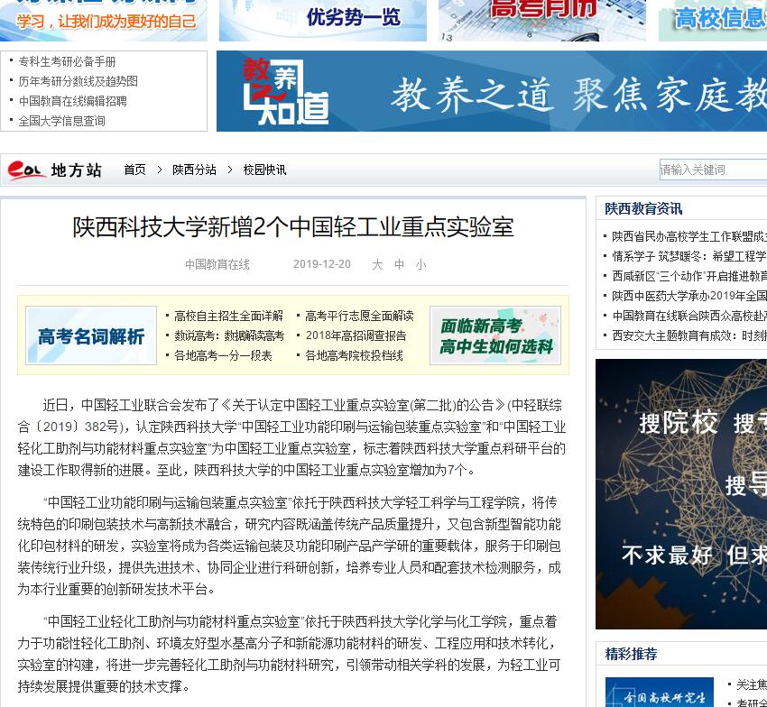 中國教育在線:陜西科技大學(xué)新增2個中國輕工業(yè)重點實驗室