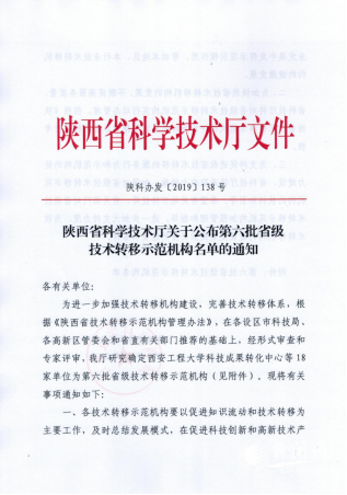 2019年12月23日,陜西省科技廳發(fā)文《關于公布第六批省級技術轉移示范機構名單的通知》(陜科辦發(fā)〔2019〕138號),陜西科技大學前沿科學與技術轉移研究院因服務能力強、業(yè)績顯著獲批陜西省第六批省級技術轉移示范機構。此舉對于該校今后進一步強化技術轉移服務效能,提升科研能力和管理水平,更好地促進科技成果的轉移、轉化,充分發(fā)揮省級技術轉移示范機構的積極帶動作用具有十分重要意義。