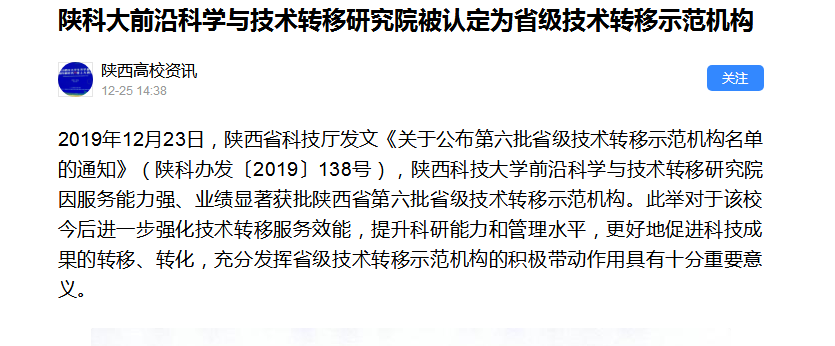 今日頭條:陜科大前沿科學與技術轉移研究院被認定為省級技術轉移示范機構