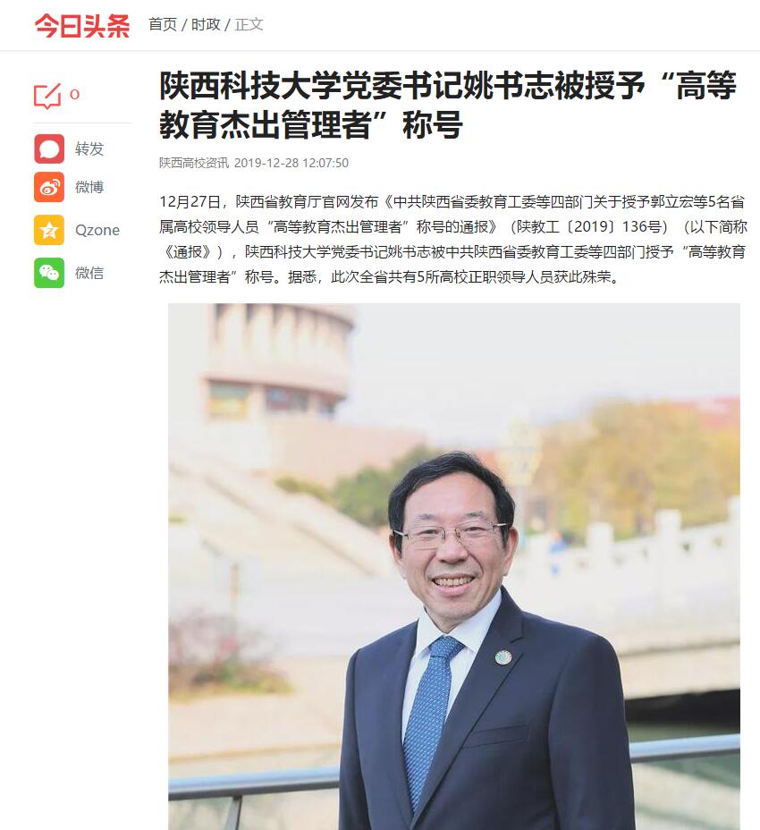 今日頭條APP:陜西科技大學(xué)黨委書記姚書志被授予“高等教育杰出管理者”稱號