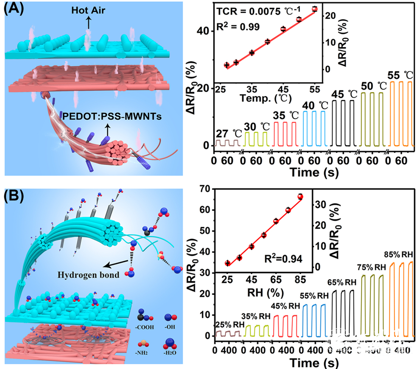 王學(xué)川教授領(lǐng)銜的生物質(zhì)與功能材料研究所長期以來一直致力于基于動物生物質(zhì)膠原及其水解物復(fù)合功能材料的研究開發(fā),該論文結(jié)合國家重點發(fā)展的柔性電子智能材料,以膠原基質(zhì)為原料構(gòu)建了多功能柔性傳感材料,為典型的跨學(xué)科交叉技術(shù)應(yīng)用,為擴寬我校輕工學(xué)科內(nèi)涵發(fā)展提供支撐。目前,實現(xiàn)柔性傳感器的生物相容性、可穿戴性、高分辨、高靈敏、低成本制造和復(fù)雜信號檢測等功能集成仍是該領(lǐng)域的重大挑戰(zhàn)。本研究以天然皮膠原為結(jié)構(gòu)基板,不同功能屬性的導(dǎo)電材料為物理摻雜導(dǎo)電構(gòu)筑單元,通過靜電紡絲技術(shù)制備雙層仿生全纖維結(jié)構(gòu)的多功能集成電子皮膚。其基于納米摩擦發(fā)電機理論,兼具自發(fā)電(壓力)、溫度和濕度檢測功能,且具有極高的壓力敏感性和寬檢測范圍、較短的濕度響應(yīng)/恢復(fù)時間、優(yōu)異的電阻溫度系數(shù)。此外,基于低成本、生物相容、透氣性好和可生物降解的優(yōu)勢,使其可廣泛應(yīng)用于智能機器人、交互式可穿戴設(shè)備和人工義肢等領(lǐng)域。該研究對生物質(zhì)膠原高值資源化及生物相容性功能集成柔性傳感材料發(fā)展具有重要的科學(xué)研究意義和應(yīng)用推廣價值。