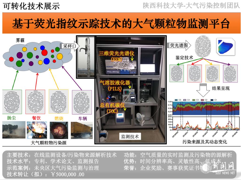 該課題研究歷時(shí)三年,得到了國家自然科學(xué)基金項(xiàng)目(41703102、41877354),陜西科技大學(xué)“青年拔尖”啟動經(jīng)費(fèi)等資金支持。主要分為兩方面的工作:一是技術(shù)方面,開發(fā)了基于熒光指紋示蹤的大氣PM2.5化學(xué)組分分析、大氣化學(xué)反應(yīng)機(jī)制探討、大氣污染來源鑒定的技術(shù)方法;二是設(shè)備方面,實(shí)現(xiàn)了大氣PM2.5在線捕獲系統(tǒng)(PILS)與三維熒光光譜(EEM)、總有機(jī)碳分析儀(TOC)的串聯(lián)并用。綜合以上兩方面的技術(shù)和硬件平臺,最終實(shí)現(xiàn)了大氣污染物在線監(jiān)測和來源解析的功能,獲得數(shù)據(jù)可應(yīng)用于精確了解大氣污染物的起源、揭示污染產(chǎn)生和消失機(jī)制,最終服務(wù)區(qū)域大氣污染的治理。團(tuán)隊(duì)以陜科大大氣監(jiān)測站點(diǎn)為中心,利用該監(jiān)測設(shè)備已相繼開展了“冬季霧霾形成過程與成因解析”“春季沙塵暴發(fā)生觀測與空氣質(zhì)量影響分析”“夏季大氣污染物化學(xué)反應(yīng)機(jī)制”等具體研究。