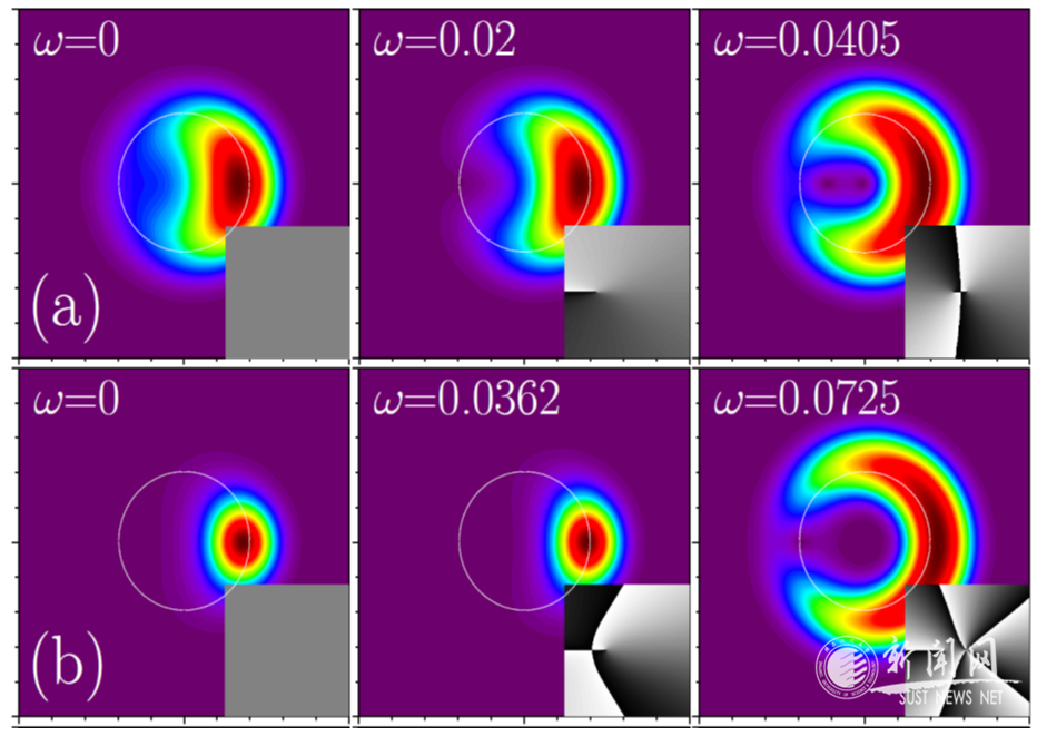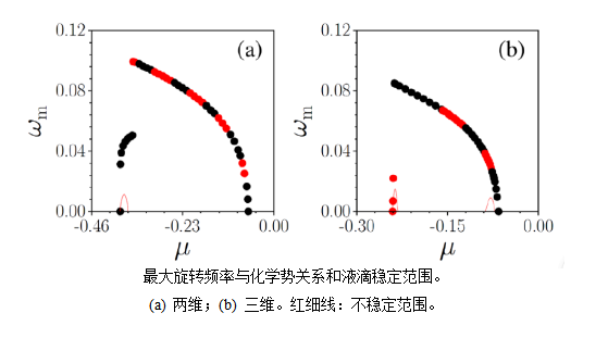 該研究基于失諧勢(shì)調(diào)制的李-黃-楊修正超平均場(chǎng)GP方程,發(fā)現(xiàn)了新型雙組份BECs中持續(xù)旋轉(zhuǎn)的超稀量子液滴。這類液滴類似于非線性作用導(dǎo)致的徑向局域化的回音壁模式。隨著化學(xué)勢(shì)和旋轉(zhuǎn)頻率的變化,液滴呈現(xiàn)出豐富多樣的形狀。從幾乎平頂?shù)綇?qiáng)烈傾斜的局域波包,延伸到幾乎整個(gè)極角范圍的新月形液滴。臨界旋轉(zhuǎn)頻率處的液滴轉(zhuǎn)變?yōu)闇u旋液滴(二維)或渦環(huán)液滴(三維),其拓?fù)渲笖?shù)隨化學(xué)勢(shì)絕對(duì)值的增加而增大。旋轉(zhuǎn)量子液滴幾乎在其整個(gè)存在區(qū)間內(nèi)都很穩(wěn)定。它們是基階和渦旋量子液滴之間的一類基于對(duì)稱破缺的新型過(guò)渡態(tài)。該研究得到陜西省高層次人才項(xiàng)目、陜西省自然科學(xué)基金和我校科研啟動(dòng)項(xiàng)目的支持。