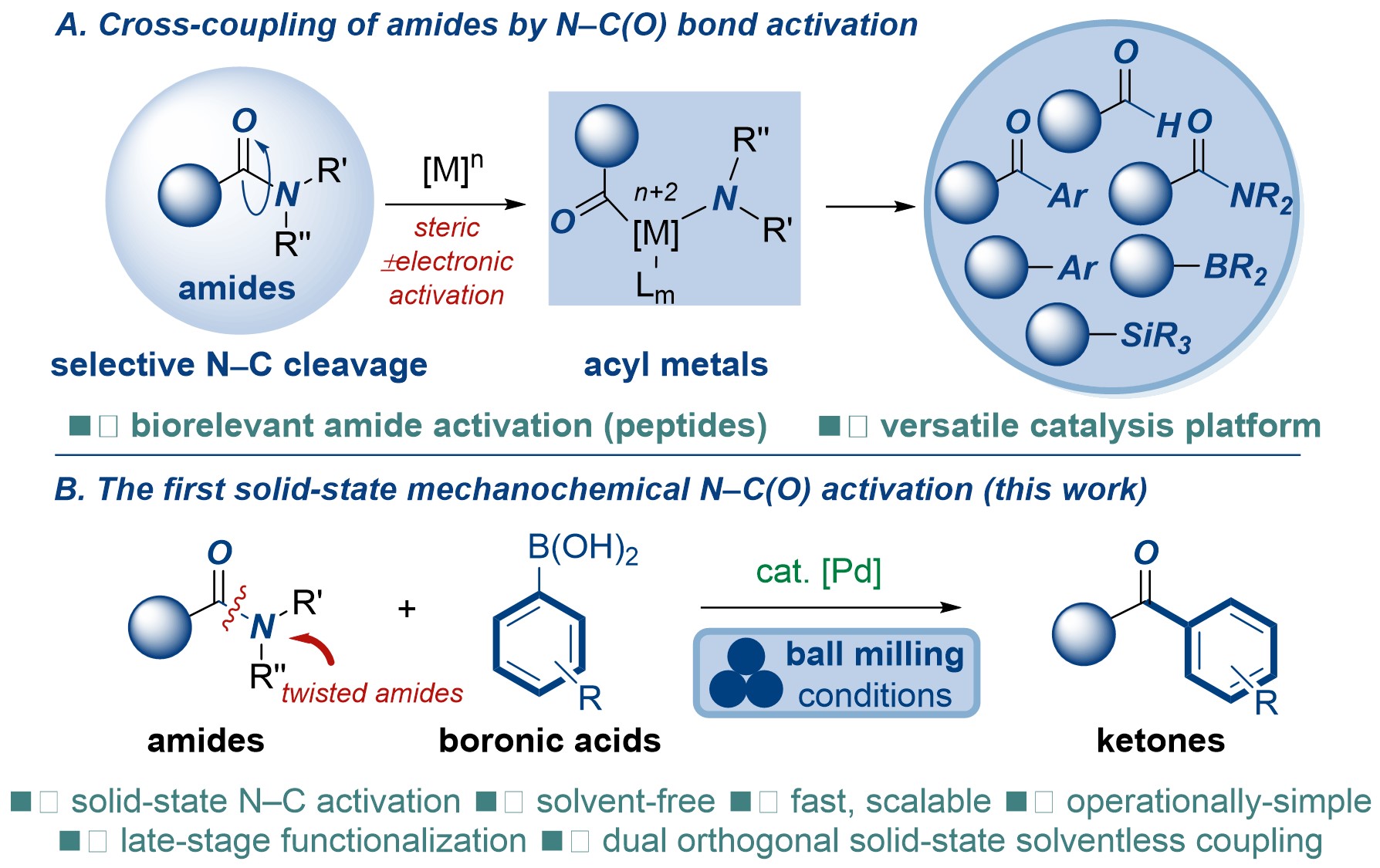“Mechanochemical Solvent-Free Suzuki–Miyaura Cross-Coupling of Amides via Highly Chemoselective N–C Cleavage首次將機械化學(xué)方法應(yīng)用于碳氮鍵選擇性斷裂的Suzuki-Miyaura交叉偶聯(lián)反應(yīng)。反應(yīng)過程不需要任何有機溶劑與額外加熱,后處理簡單,反應(yīng)高效,并可用于醫(yī)藥中間體的合成、復(fù)雜藥物的后期修飾與機械化學(xué)條件下的串聯(lián)偶聯(lián)反應(yīng)。本研究不僅豐富了酰胺鍵的活化反應(yīng)研究,而且為有機合成化學(xué)中惰性化學(xué)鍵的活化反應(yīng)提供了新思路。