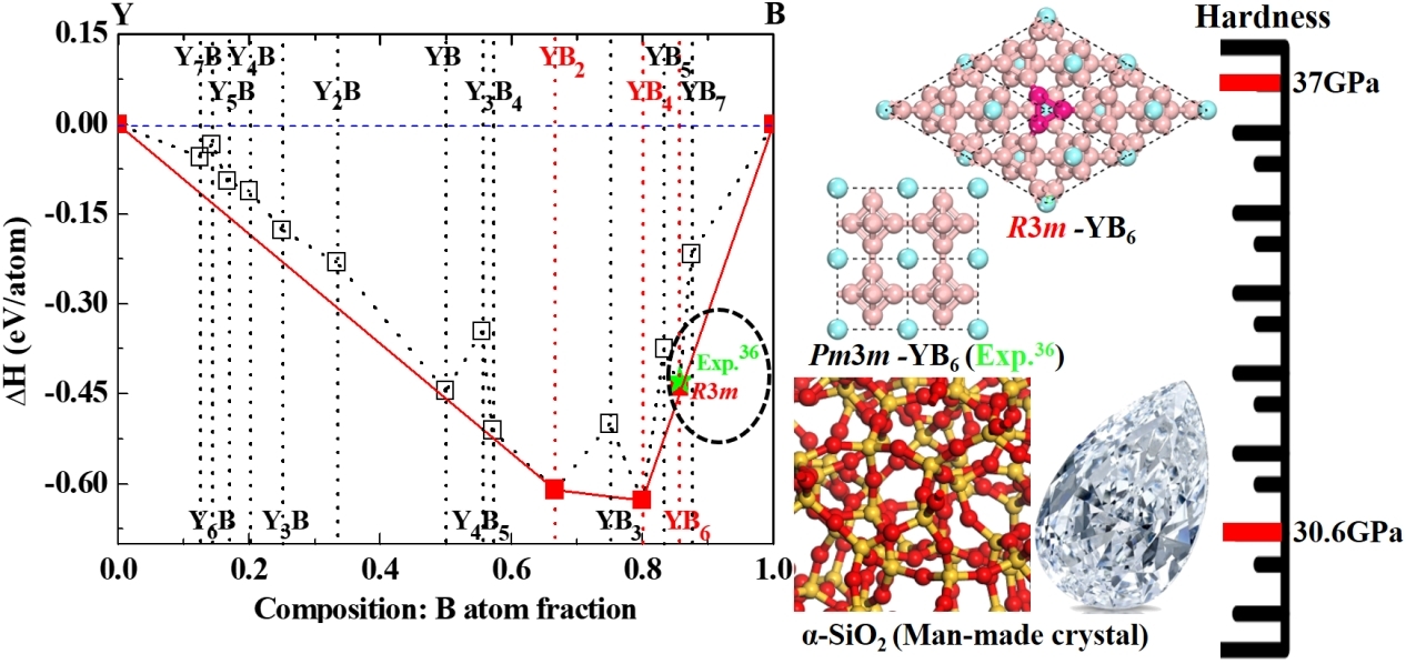 成果3:硼化釔因其超導(dǎo)性和高化學(xué)穩(wěn)定性而備受關(guān)注。然而,硼化釔的機(jī)械性能和硬度的相關(guān)知識(shí)還不清楚。基于CALYPSO全局結(jié)構(gòu)搜索技術(shù)和第一性原理,對(duì)不同化學(xué)配比的硼化釔進(jìn)行了系統(tǒng)研究。結(jié)果預(yù)測(cè)了一種具有R3m六方結(jié)構(gòu)的新型硼釔化合物YB6,與實(shí)驗(yàn)合成的Pm3?m結(jié)構(gòu)相比,預(yù)測(cè)的R3m-YB6更穩(wěn)定。計(jì)算的生成焓、彈性常數(shù)和聲子譜清晰的表明,R3m-YB6具有較高的機(jī)械穩(wěn)定性和動(dòng)力學(xué)穩(wěn)定性。電子態(tài)密度和能帶結(jié)構(gòu)顯示,所有穩(wěn)定的硼酸釔都具有金屬性。基于我們開(kāi)發(fā)的半經(jīng)驗(yàn)硬度公式,計(jì)算R3m-YB6的維氏硬度為37.0 GPa,表明它是一種潛在的超硬金屬。該研究為實(shí)驗(yàn)合成超硬硼化釔晶體提供理論依據(jù)。該研究成果發(fā)表于自然指數(shù)期刊“Journal of Physical Chemistry Letter 12, 5423-5429 ”。丁利蘋副教授為第一作者,邵鵬副教授為共同通訊作者。