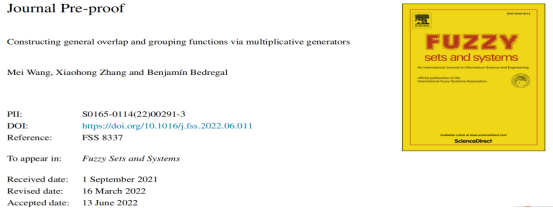 [4] Mei Wang, Xiaohong Zhang*, Benjam?n Bedregal, Constructing general overlap and grouping functions via multiplicative generators, Fuzzy Sets and Systems, 2022,DOI:10.1016/j.fss.2022.06.011.