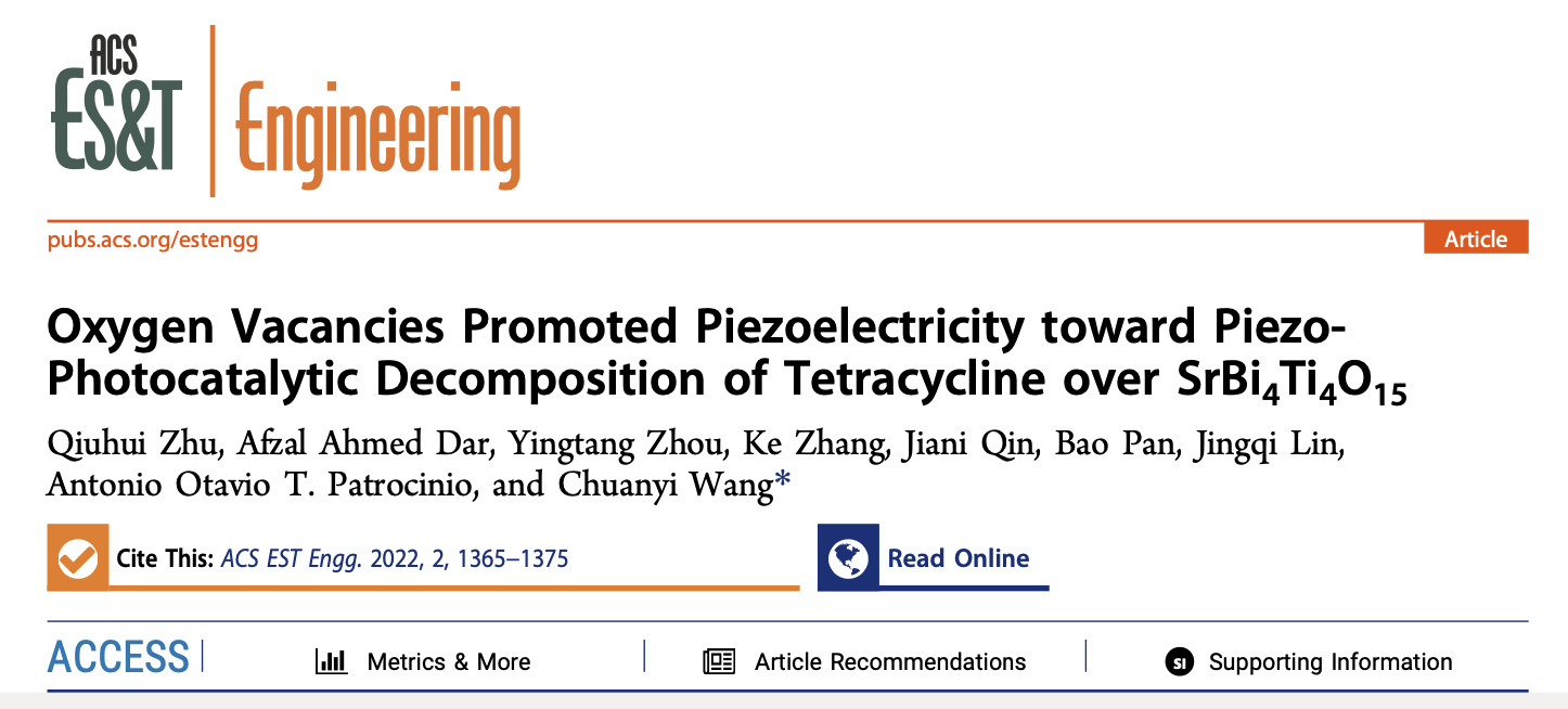 Qiuhui Zhu, Afzal Ahmed Dar, Yingtang Zhou, Ke Zhang, Jiani Qin, Bao Pan, Jingqi Lin, Antonio Otavio T. Patrocinio, and Chuanyi Wang. Oxygen Vacancies Promoted Piezoelectricity toward Piezo-Photocatalytic Decomposition of Tetracycline over SrBi4Ti4O15.ACS EST Engg.2022, 2022, 2, 8, 1365–1375.