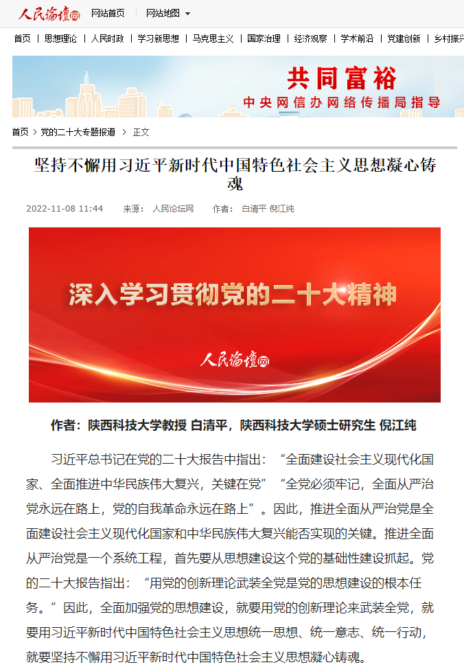 近日,人民論壇網(wǎng)“黨的二十大專題報道”刊發(fā)我校馬克思主義學(xué)院教授白清平、碩士研究生倪江純的理論文章《堅持不懈用習(xí)近平新時代中國特色社會主義思想凝心鑄魂》。