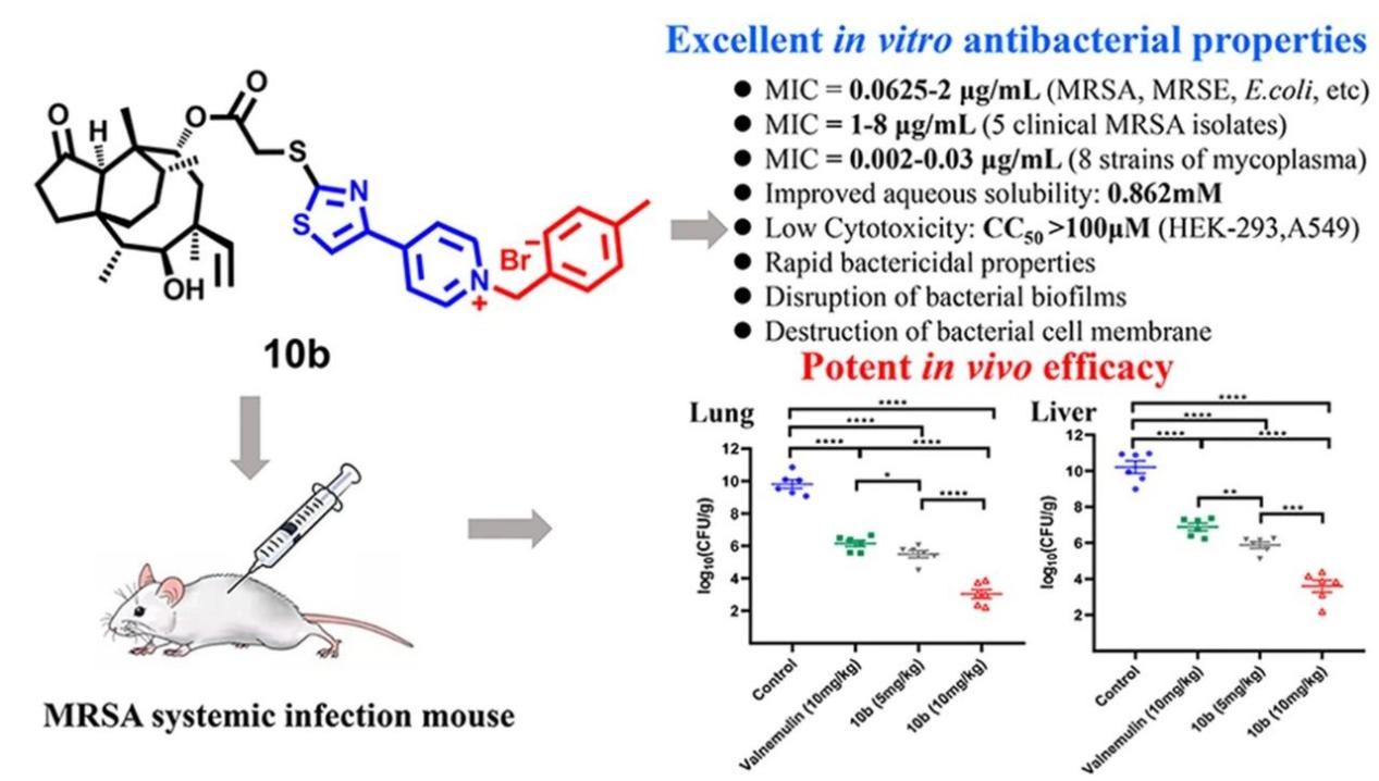 課題組基于截短側(cè)耳素類抗生素獨(dú)特的抗菌作用機(jī)制,將優(yōu)勢(shì)片段引入分子骨架中并結(jié)合季銨化修飾策略設(shè)計(jì)合成了一系列新型的季銨鹽型截短側(cè)耳素衍生物。其中,候選化合物10b對(duì)多種臨床分離耐藥菌如耐甲氧西林葡萄球菌(MRSA)、萬(wàn)古霉素耐藥腸球菌(VRE)、耐碳青霉烯類鮑曼不動(dòng)桿菌(CR-AB)等顯示出優(yōu)異的抗菌活性(MIC= 0.0625-2 μg/mL),大幅優(yōu)于已上市截短側(cè)耳素類抗生素瑞他莫林,并對(duì)五種臨床分離的MRSA的抗菌活性優(yōu)于臨床一線治療藥物莫西沙星。10b還顯示出優(yōu)異的抗支原體活性,對(duì)雞毒支原體、人肺炎支原體等的抑制活性是泰妙菌素的10-100倍以上。在小鼠MRSA全身感染模型中,10b能夠有效提高感染小鼠的存活率,顯著降低病理組織的細(xì)菌負(fù)載量,改善病理組織的炎癥情況,體內(nèi)藥效顯著優(yōu)于上市藥物沃尼妙林。
