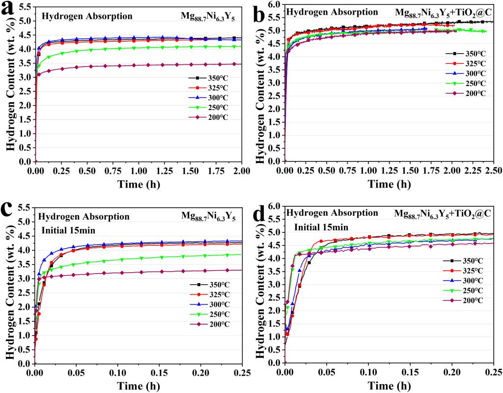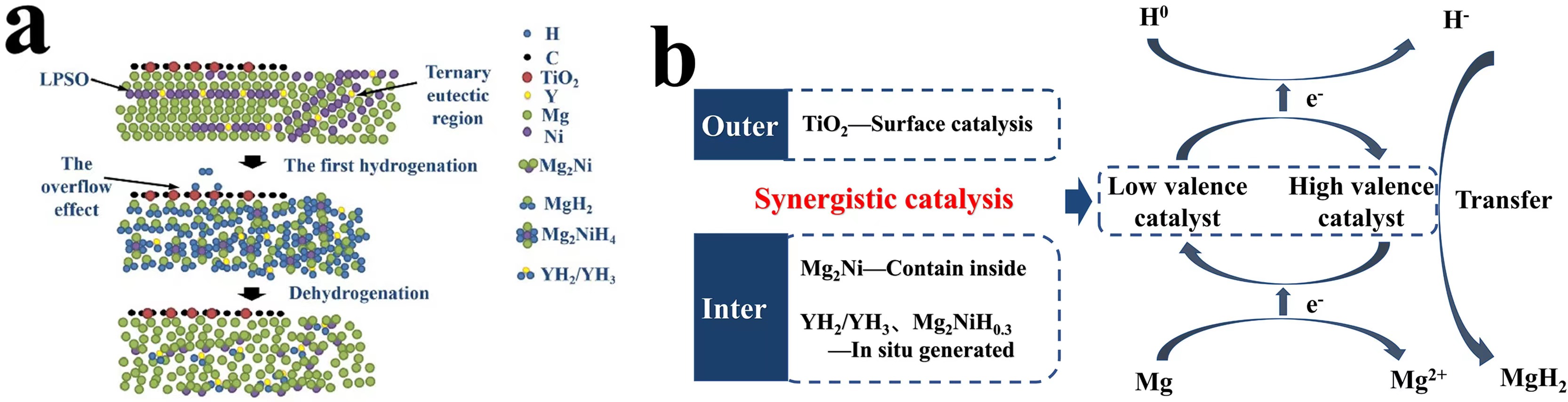 宋文杰團(tuán)隊(duì)通過(guò)合金成分設(shè)計(jì),制備了一種含有14H型LPSO(長(zhǎng)周期堆積有序)結(jié)構(gòu)和三元共晶組織的Mg-Ni-Y儲(chǔ)氫合金。通過(guò)增加內(nèi)部擴(kuò)散通道、內(nèi)部原位自生和外加添加納米催化劑進(jìn)行協(xié)同催化,顯著提高了合金的儲(chǔ)氫性能。氫化過(guò)程中LPSO結(jié)構(gòu)的分解導(dǎo)致了大量納米晶體的形成,提供了豐富的相邊界和活化點(diǎn)。納米級(jí)的TiO2@C催化劑均勻地分散在合金顆粒的表面,TiO2@C的“氫泵”效應(yīng)加速了氫氣在合金顆粒表面的解離和擴(kuò)散。鎂基固態(tài)儲(chǔ)氫材料可逆儲(chǔ)氫量為5.32wt.%,開(kāi)始放氫溫度降低至200℃,在200℃和30bar條件下,1分鐘內(nèi)達(dá)到4.25wt.%的吸氫量。團(tuán)隊(duì)的研究工作為鎂基固態(tài)儲(chǔ)氫材料的性能大幅度改善提供了解決方案,有助于推進(jìn)鎂基固態(tài)儲(chǔ)氫材料的商業(yè)化應(yīng)用。