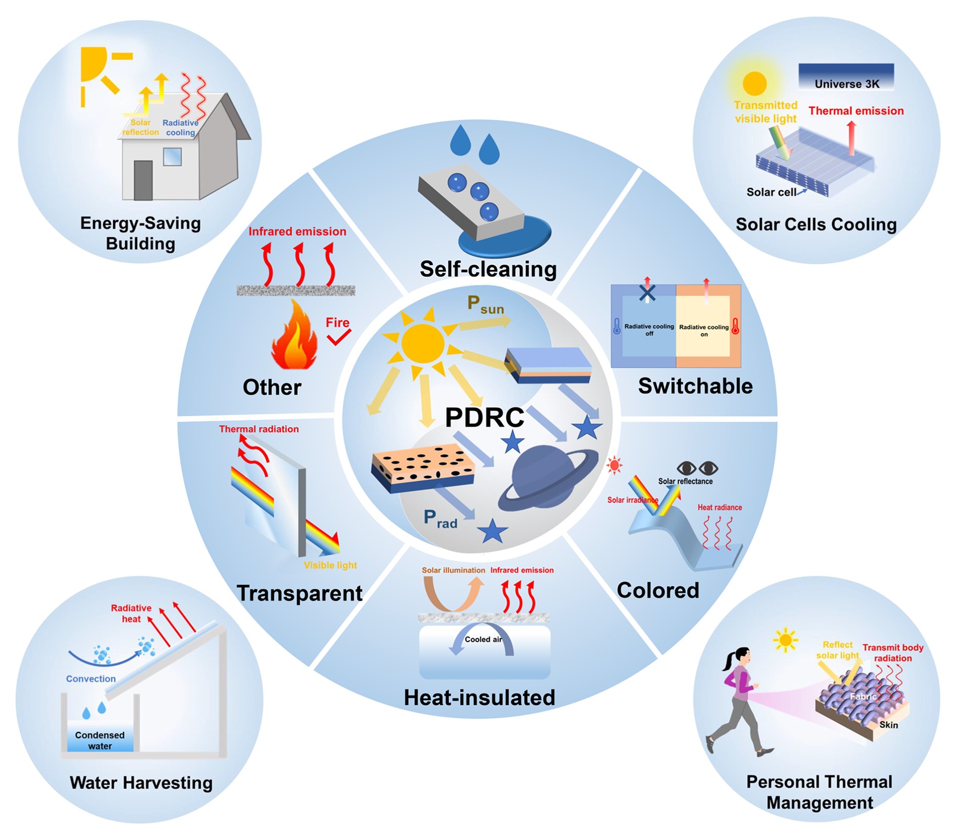 2.關(guān)于多功能化方面,論文總結(jié)了各種多功能輻射降溫材料或器件以滿(mǎn)足不同應(yīng)用場(chǎng)景需求,如自清潔輻射降溫、溫度自適應(yīng)智能輻射降溫、彩色輻射降溫、隔熱輻射降溫等,并歸納了相應(yīng)功能需求的光學(xué)設(shè)計(jì)原則及多功能輻射降溫材料或器件的應(yīng)用潛力。
