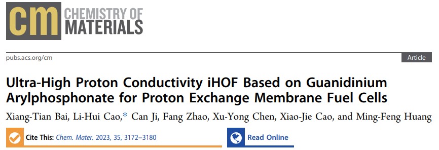 相關(guān)成果以“Ultra-High Proton Conductivity iHOF Based on Guanidinium Arylphosphonate for Proton Exchange Membrane Fuel Cells”為題,發(fā)表在Chemistry of Materials上(IF =10.508)上。陜西科技大學(xué)為論文唯一通訊單位,化學(xué)與化工學(xué)院2022級(jí)博士研究生白向田為該論文的第一作者,曹麗慧教授為第二作者和論文唯一通訊作者。