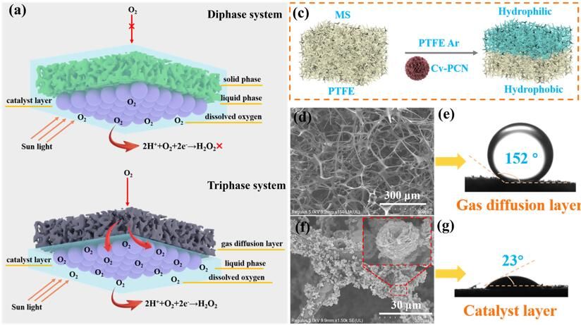 電荷復(fù)合速度快、雙電子氧還原反應(yīng)選擇性低、O2擴(kuò)散速率低等問(wèn)題阻礙了光催化產(chǎn)H2O2的實(shí)際應(yīng)用。基于此,本工作創(chuàng)新性提出通過(guò)界面工程改善光催化過(guò)程中的傳質(zhì)障礙,構(gòu)建一種氣-液-固三相界面催化系統(tǒng),用于從純水中高效光催化生成H2O2。其中,以三聚氰胺-三聚氰酸前體(MCP)和聚吡咯(PPy)超分子熱解合成花狀石墨相碳化氮(Cv-PCN)高選擇性的將O2還原為H2O2。隨后將其負(fù)載的多孔材料表面并進(jìn)行界面潤(rùn)濕性調(diào)控構(gòu)建氣-液-固三相界面光催化體系,該體系大大降低了O2的傳質(zhì)阻力,有效地提高了界面O2濃度,從而極大提高了光生電子與空穴的分離效率和 H2O2的反應(yīng)動(dòng)力學(xué)。本研究為高效光催化生產(chǎn)H2O2催化體系的設(shè)計(jì)提供了新的思路。