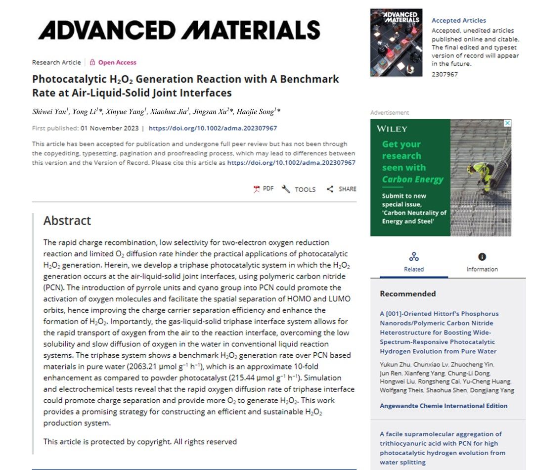 [1] Photocatalytic H2O2 Generation Reaction with A Benchmark Rate at Air-Liquid-Solid Joint Interfaces, Advanced Materials, 2023, 2307967.