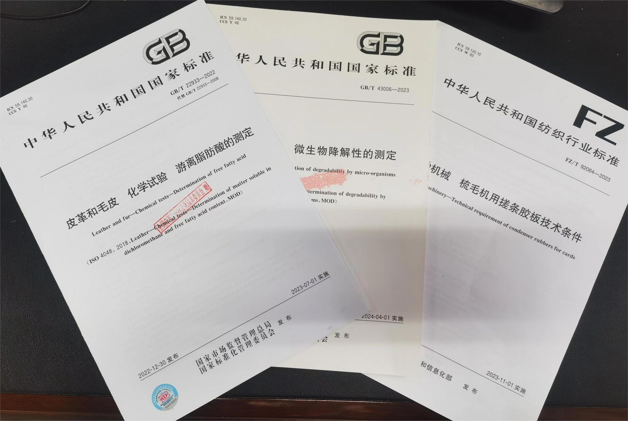 近日,我校強(qiáng)濤濤教授承擔(dān)的《皮革和毛皮化學(xué)試驗(yàn)游離脂肪酸的測(cè)定》(標(biāo)準(zhǔn)編號(hào):GB/T22933-2022)、《皮革和毛皮微生物降解的測(cè)定(標(biāo)準(zhǔn)編號(hào):GB/T43006-2023)》等兩項(xiàng)國(guó)家標(biāo)準(zhǔn)和一項(xiàng)紡織行業(yè)標(biāo)準(zhǔn)《紡紗機(jī)械梳毛機(jī)用搓條膠膠板技術(shù)條件》(標(biāo)準(zhǔn)編號(hào):FZ/T92064-2023)正式發(fā)布。