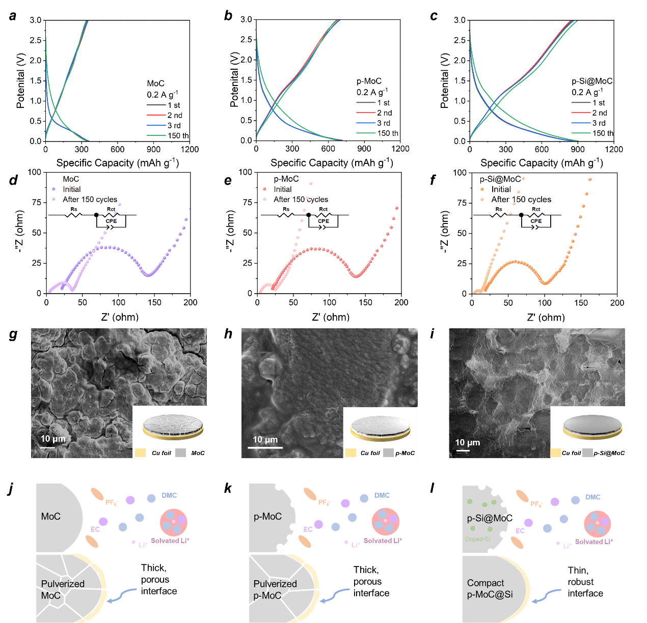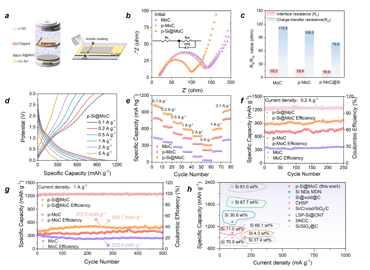 作為鋰離子電池負(fù)極材料,p-Si@MoC展現(xiàn)出了極小的電極/電解質(zhì)界面阻抗(Rs)和電荷轉(zhuǎn)移阻抗(Rct)。值得注意的是,優(yōu)化后p-Si@MoC負(fù)極在250次循環(huán)后顯示976.6 mAh g-1的放電容量,而p-MoC在250次循環(huán)后的放電容量為800.6 mAh g-1。根據(jù)p-Si@MoC中Si的含量(4.3 wt%)計算出硅的理論容量為180.6 mAh g-1。因此,我們認(rèn)為這種獨特的多孔結(jié)構(gòu)可以最大限度地利用Si摻雜來提高容量,且Si的容量利用率可達(dá)97.5%。