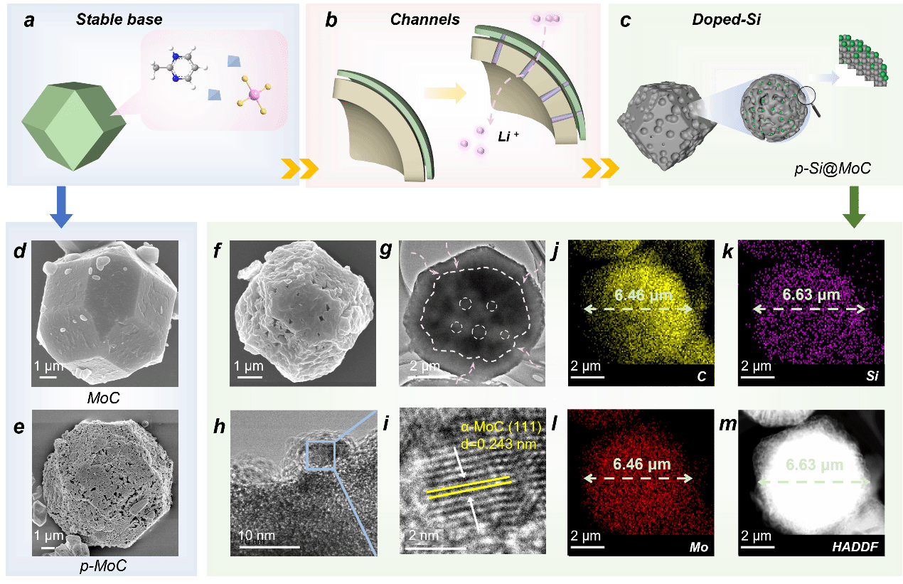 鑒于此,黃文歡教授團(tuán)隊,采用ZnMo雙金屬雜化沸石咪唑酸鹽框架(HZIF-ZnMo),開發(fā)和設(shè)計了一種超低4.3 wt%的硅摻雜多孔MoC材料,并進(jìn)一步探索了其在高容量鋰離子電池中的潛力(在0.2 A g?1下進(jìn)行250次循環(huán)后,容量為976.6 mAh g?1)。研究表明,多孔MoC作為基底,不僅為鋰離子的快速擴(kuò)散提供了連續(xù)的通道,還使超低含量的硅在多孔基體中高度均勻分布,有效誘導(dǎo)硅在循環(huán)過程中實現(xiàn)自身容量的最大利用,研究成果發(fā)表于學(xué)術(shù)期刊Advanced Functional Materials,題為“Ultra-Low 4.3 wt% Silicon Thermal Reducing Doped Porous Si@MoC as Highly Capable and Stable Li-Ion Battery Anode”