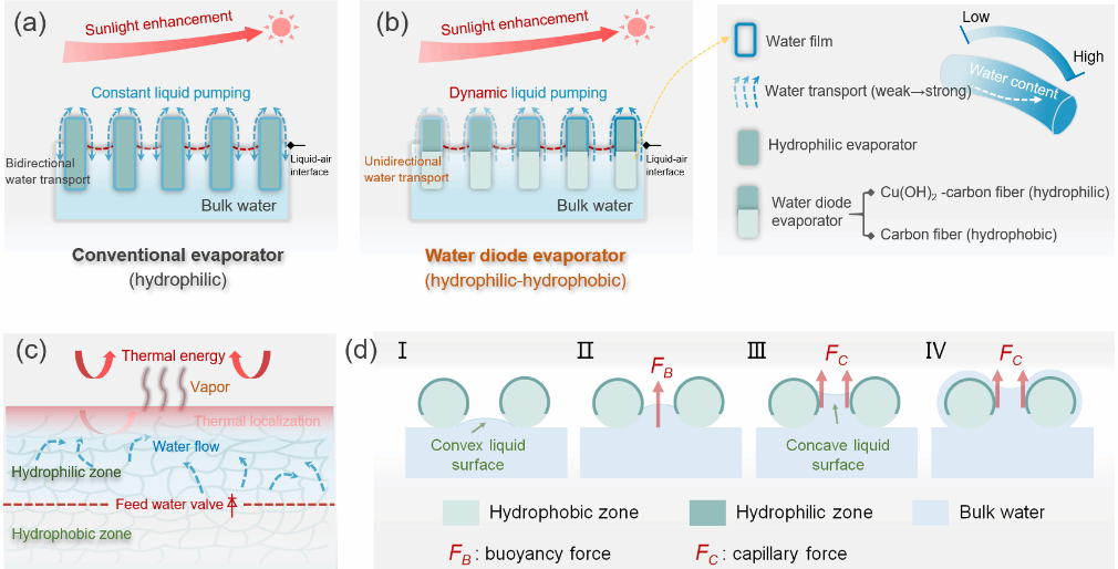 近年來,用于緩解全球水問題的界面太陽能驅(qū)動蒸發(fā)(ISDE)技術(shù)引起了研究者的極大關(guān)注。其中,ISDE系統(tǒng)的供水管理在有效的能量匹配中具有越來越重要的作用。傳統(tǒng)系統(tǒng)中輸入能量和所需能量之間的不匹配嚴重影響了轉(zhuǎn)換效率。鑒于此,王成兵教授團隊提出并設(shè)計了一種新型的“水二極管”光熱蒸發(fā)器,得益于非對稱表面潤濕性梯度和單向水傳輸特點,該蒸發(fā)器的供水速度可以隨著光強的增加而顯著加快,表現(xiàn)出對光照強度的自適應(yīng)能力。