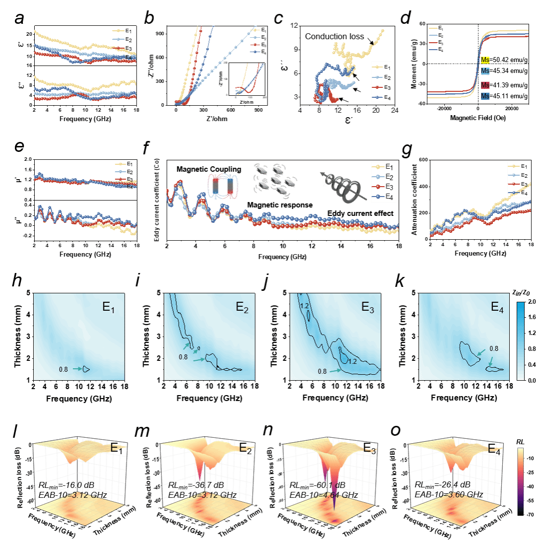 3. 對(duì)于電磁波的傳導(dǎo)及耗散機(jī)理,通過(guò)COMSOL仿真軟件模擬了不同頻率下的動(dòng)態(tài)損耗過(guò)程,揭示了電磁波的阻抗特性與原位衰減過(guò)程。深入解釋了阻抗匹配和衰減能力在電磁波吸收中的作用機(jī)制。