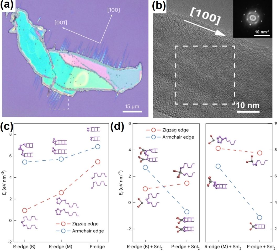 (a) 單晶黑磷納米帶光學(xué)圖像及(b) TEM圖;(c) 重構(gòu)邊界和原始邊界的形成能;(d) 有礦化劑SnI2分子存在時(shí)的重構(gòu)邊界和原始邊界的形成能