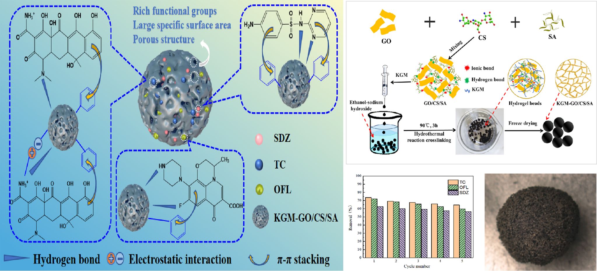 本論文的創(chuàng)新之處在于開發(fā)了一種新型魔芋葡甘聚糖(KGM)-氧化石墨烯(GO)/殼聚糖(CS)/海藻酸鈉(SA)復(fù)合氣凝膠球,采用KGM作為交聯(lián)劑,用簡(jiǎn)單的溶膠-凝膠和滴落法制備。這種氣凝膠在抗生素水體污染治理中表現(xiàn)出極高的吸附效率和快速的吸附動(dòng)力學(xué),尤其是對(duì)四環(huán)素、氧氟沙星和磺胺嘧啶的吸附效率高且可再生循環(huán)使用,在污水處理中有較好應(yīng)用前景。