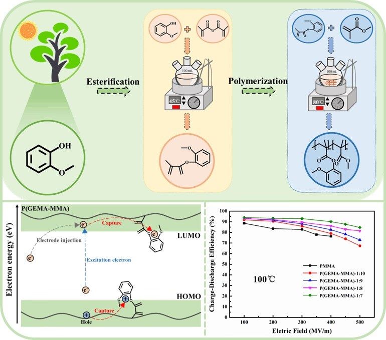 本論文的創(chuàng)新之處在于將生物質(zhì)材料丙烯酸愈創(chuàng)木酚酯(GEMA)與甲基丙烯酸甲酯(MMA)制備了一種新型生物基共聚物電介質(zhì)—聚(愈創(chuàng)木酚甲基丙烯酸酯-甲基丙烯酸甲酯)[P(GEMA-MMA)],發(fā)現(xiàn)了愈創(chuàng)木酚結(jié)構(gòu)的高HOMO能級(jí)有助于捕獲和陷阱自由電荷載體,顯著提升了材料的能量存儲(chǔ)性能,室溫下的擊穿強(qiáng)度高達(dá)710.5 MV/m,比純PMMA高出32.5%,且在500 MV/m下的充放電效率達(dá)到了87.0%,遠(yuǎn)高于純PMMA的70%。即使在100°C高溫條件下,其能量存儲(chǔ)效率仍可維持在84.7%的高水平。此研究為生物基電介質(zhì)薄膜的開發(fā)提供了一種新方法。