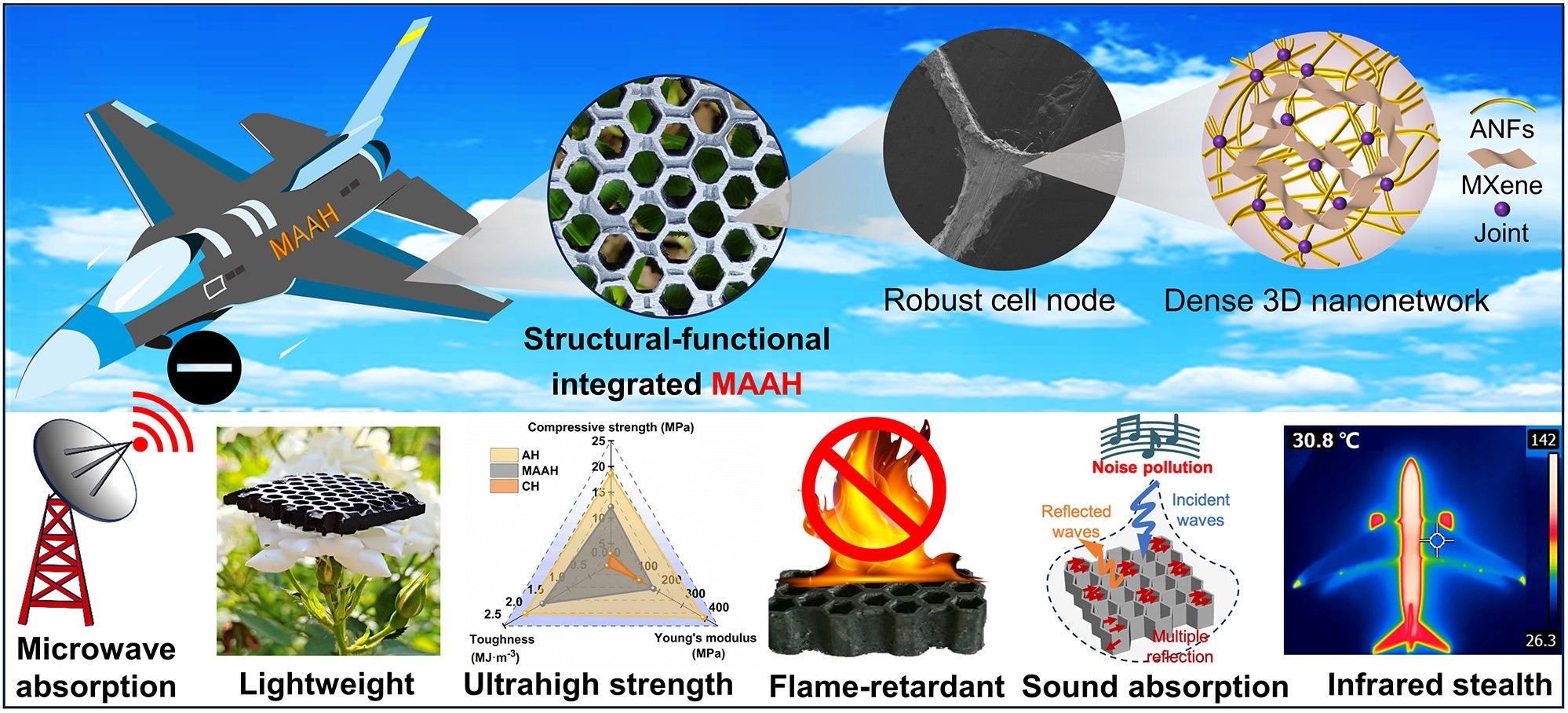 團(tuán)隊(duì)開發(fā)了一種納米雜化組裝策略制備了可擴(kuò)展、可回收、無樹脂的結(jié)構(gòu)功能一體化的芳綸蜂窩吸波(MAAH)材料。得益于芳綸納米纖維相互交織形成的一體化超強(qiáng)蜂窩節(jié)點(diǎn)設(shè)計(jì)以及致密的三維網(wǎng)絡(luò)結(jié)構(gòu),蜂窩的抗壓強(qiáng)度和韌性分別是商用芳綸蜂窩的6倍和25倍。更重要的是,MXene導(dǎo)電網(wǎng)絡(luò)與蜂窩的多孔結(jié)構(gòu)以及導(dǎo)電損耗、偶極和界面極化的協(xié)同作用使其具有優(yōu)異的吸波性能,在厚度僅為1.9 mm反射損耗最小值可以達(dá)到-38.5 dB,幾乎覆蓋了整個(gè)X波段。此外,MAAH還具有出色的紅外熱隱身、吸音性能和結(jié)構(gòu)完整性的實(shí)時(shí)監(jiān)測功能,在航空航天和軍事民用等領(lǐng)域具有廣闊的應(yīng)用前景。該研究“Functional-Structural Integrated Aramid Nanofiber?based Honeycomb Materials with Ultrahigh Strength and Multi?Functionalities”發(fā)表在《Advanced Fiber Materials》上。博士研究生孫浩為本文第一作者,楊斌副教授、張美云教授為通訊作者。