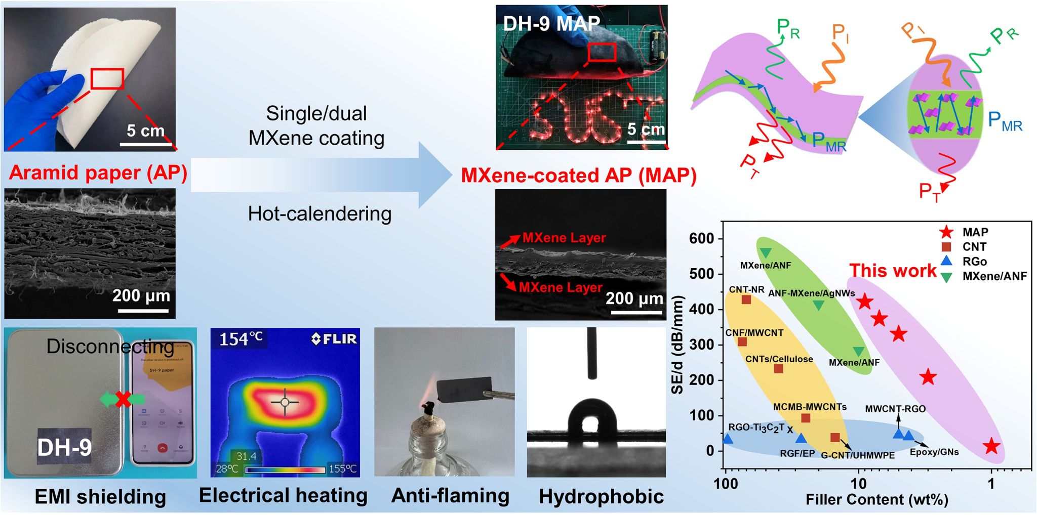 針對(duì)不良電磁干擾對(duì)高精度電子設(shè)備的性能、信息安全和人類健康造成的不利影響,在芳綸紙表面選擇性地單層/雙層涂覆 MXene涂層,制備了一種具有高效電磁屏蔽和優(yōu)異電熱性能的柔性紙基功能材料。在較低的導(dǎo)電填料添加量下(9.0 wt%)電磁屏蔽紙表現(xiàn)出優(yōu)異EMI屏蔽效能,即使在經(jīng)歷 5000 次反復(fù)彎曲循環(huán)后也仍保留了較佳的屏蔽效能。此外,復(fù)合紙還具有出色焦耳電加熱能力(在5 V的低驅(qū)動(dòng)電壓下,電熱溫度達(dá)到 150 °C)和出色的阻燃性。研究成果以“Mechanically Strong, Flexible, And Flame-Retardant Ti3C2Tx MXene-Coated Aramid Paper with Superior Electromagnetic Interference Shielding and Electrical Heating Performance”發(fā)表在《Chemical Engineering Journal》上。碩士研究生汪浩然為本研究的主要完成人,楊斌副教授、陸趙情教授為通訊作者。