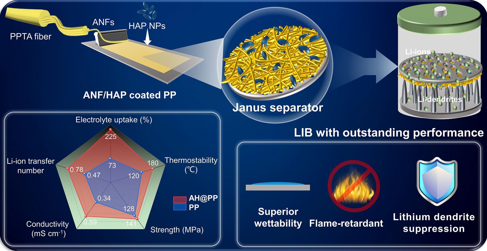 針對(duì)目前商業(yè)化的聚烯烴隔膜存在的熱穩(wěn)定性差、潤濕性低、易被鋰枝晶刺穿等問題,導(dǎo)致鋰電池易發(fā)生熱失控和短路等安全隱患問題,利用芳綸納米纖維和羥基磷灰石納米顆粒作為主要構(gòu)筑單元,在聚烯烴隔膜表面涂覆三維納米網(wǎng)絡(luò)保護(hù)層,制備了一種具有高強(qiáng)度、高模量、納米孔隙結(jié)構(gòu)的Janus隔膜(AH@PP)。復(fù)合隔膜具有優(yōu)異的熱穩(wěn)定性,保持著較高的鋰離子傳輸效率和電化學(xué)表現(xiàn)能力,同時(shí),具有高模量和納米級(jí)孔隙結(jié)構(gòu)的涂層能夠有效抵御鋰枝晶的穿刺,在軟包電池中的成功應(yīng)用也證明了其應(yīng)用的普適性。該研究“Janus separator with high-temperature resistance and dendrite suppression for advanced Li-ions batteries”發(fā)表在Journal of Power Sources上。碩士研究生龐瑞雪是論文的主要完成人,楊斌副教授、張美云教授為通訊作者。