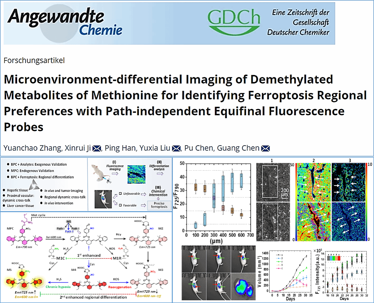 近日,我?;瘜W(xué)與化工學(xué)院陳光教授課題組在新型熒光分子開發(fā)方面取得重要進展,相關(guān)研究成果以“Microenvironment-differential Imaging of Demethylated Metabolites of Methionine for Identifying Ferroptosis Regional Preferences with Path-independent Equifinal Fluorescence Probes”為題發(fā)表在《Angew. Chem.》(自然指數(shù)期刊,綜合性1區(qū)TOP期刊),我校為第一通訊單位,化學(xué)與化工學(xué)院博士生張遠超為第一作者,陳光教授為通訊作者,加拿大滑鐵盧大學(xué)的Xinrui Ji研究員及我校劉玉霞副教授為共同通訊作者。國家自然科學(xué)基金面上項目(22174090)提供經(jīng)費支持。該研究的發(fā)表極大地推進了我校在相關(guān)學(xué)科領(lǐng)域的影響力。