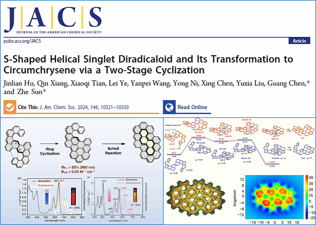 此外,為開發(fā)新型熒光分子,陳光教授課題組與天津大學(xué)孫哲教授課題組聯(lián)合研究了利用單線態(tài)雙自由基關(guān)環(huán)反應(yīng)合成高量子產(chǎn)率大環(huán)熒光母體。相關(guān)研究成果以“S-Shaped Helical Singlet Diradicaloid and Its Transformation to Circumchrysene via a Two-Stage Cyclization”為題發(fā)表在《Journal of the American Chemical Society》(自然指數(shù)期刊,綜合性1區(qū)TOP期刊),我校為第二通訊單位,陳光教授為共同通訊作者。文中設(shè)計并合成了具有單線態(tài)雙自由基基態(tài)的S形雙重螺烯化合物。該化合物的雙自由基性質(zhì),降低了熱激發(fā)電環(huán)化反應(yīng)的反應(yīng)能壘,使得其可在螺烯位置快速高效地進行級聯(lián)電環(huán)化反應(yīng)構(gòu)建兩個C-C鍵,并在氧化劑存在的情況下實現(xiàn)脫氫得到共軛延展的螺烯化合物。最后作者利用Scholl反應(yīng)實現(xiàn)了關(guān)環(huán)反應(yīng),得到了環(huán)屈化合物,其性質(zhì)穩(wěn)定、熒光量子產(chǎn)率高,對于后續(xù)開發(fā)高亮度熒光分子并用于腫瘤切除手術(shù)導(dǎo)航等領(lǐng)域具有重要參考價值。