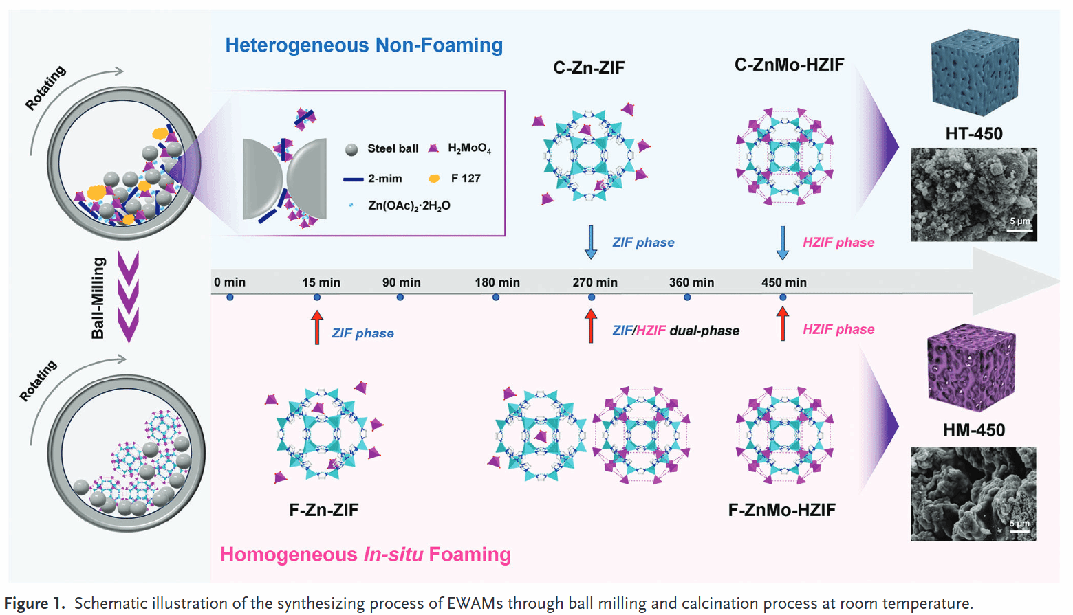 為了解決上述問(wèn)題,陜西科技大學(xué)黃文歡教授團(tuán)隊(duì)開(kāi)發(fā)出了一種簡(jiǎn)便且可擴(kuò)展實(shí)施的策略,即利用ZnMo-HZIF材料,通過(guò)球磨發(fā)泡和高溫煅燒工藝,成功構(gòu)建出多氮摻雜的MoC/NC三維泡沫結(jié)構(gòu)復(fù)合材料。這項(xiàng)工作提出了關(guān)于結(jié)構(gòu)和組分對(duì)電磁波吸收性能協(xié)同效應(yīng)的新視角,并為制備輕質(zhì)高性能MOF基電磁波吸收材料提供了新方法。相關(guān)工作在《Advanced Functional Materials》期刊上以“In situ Mechanical Foaming of Hierarchical Porous MoC for Assembling Ultra-light, Self-cleaning, Heat-insulation, Flame-retardant, and Infrared-stealth Device”為題發(fā)表。