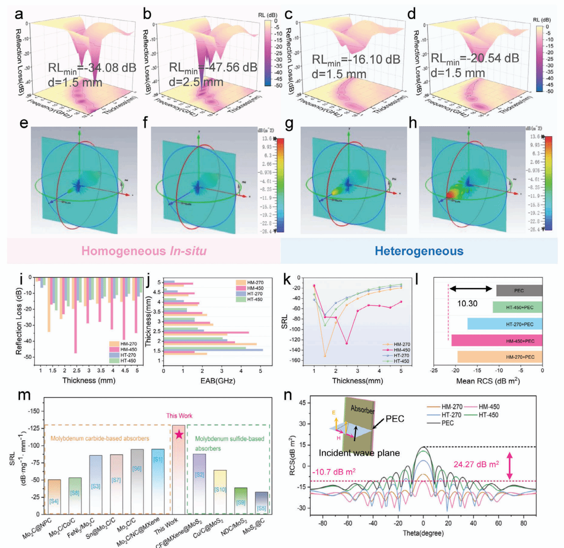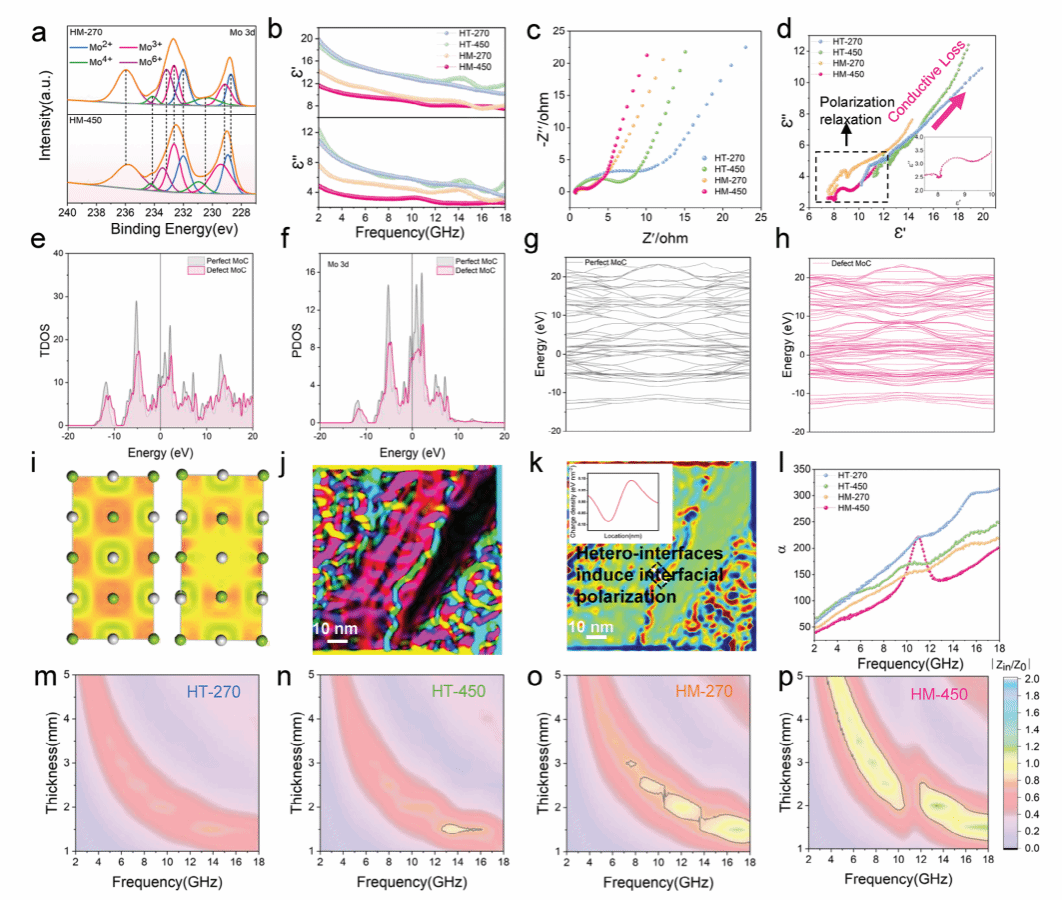 文章亮點(diǎn)包括:通過(guò)機(jī)械球磨的方法制備出泡沫結(jié)構(gòu),為材料內(nèi)部帶來(lái)了顯著的孔隙,這種泡沫結(jié)構(gòu)使得入射電磁波能夠發(fā)生多次反射,為波的傳播提供了眾多路徑;高度石墨化可以誘發(fā)高效的電子遷移和跳躍,加速電導(dǎo)率的損失和電磁波的吸收。在外加電磁場(chǎng)的作用下,MoC/NC異質(zhì)界面中存在的大量氮原子會(huì)導(dǎo)致更多的界面/偶極子極化;碳基質(zhì)中的鉬缺陷會(huì)破壞電荷分布平衡,促進(jìn)偶極子極化和電磁波能量的耗散。因此,優(yōu)異的電磁吸收性能來(lái)源于泡沫多級(jí)孔結(jié)構(gòu)、多個(gè)異質(zhì)界面、鉬缺陷及大量摻雜原子之間的協(xié)同效應(yīng);設(shè)計(jì)出的裝置經(jīng)過(guò)簡(jiǎn)單的浸漬和高溫還原過(guò)程后,表現(xiàn)出優(yōu)異的疏水性、阻燃性和紅外隱身特性。