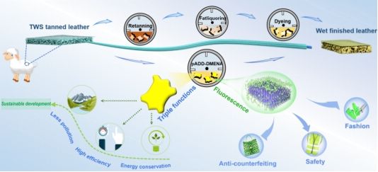 6. 團(tuán)隊(duì)設(shè)計(jì)合成多功能熒光兩性聚合物(簡(jiǎn)稱pADD-DMENA),開發(fā)了生態(tài)有機(jī)無(wú)鉻皮革制造的顛覆性“三位一體”策略。pADD-DMENA表現(xiàn)出優(yōu)異的復(fù)鞣、加脂和染色性能,柔軟度為8.5 mm,增厚率為40%,抗張強(qiáng)度為19.77 MPa,撕裂強(qiáng)度為59.40 N/mm。且與傳統(tǒng)陰離子染色皮革相比,pADD-DMENA染色皮革表面呈現(xiàn)均勻的亮黃色,并且具有優(yōu)異的耐光性、耐久性和耐洗性。此外,其熒光本體能夠?qū)ε鞲锖臀鬯械膒ADD-DMENA進(jìn)行視覺跟蹤,從而可以實(shí)時(shí)監(jiān)測(cè)pADD-DMENA的精確分布。綜上所述,pADD-DMENA的開發(fā)可以一步完成傳統(tǒng)的濕整理工藝,有效節(jié)省工藝時(shí)間,減少各種化學(xué)品的添加11.2%,并表現(xiàn)出更好的廢水降解性(BOD5/COD為0.35)。這一創(chuàng)新策略為生態(tài)皮革制造向低能耗、少污染的綠色方向拓寬了道路。相關(guān)成果發(fā)表在Green Chemistry(DOI: 10.1039/D3GC01446K)上。陜西科技大學(xué)博士研究生魏超為本論文的第一作者,通訊作者為陜西科技大學(xué)輕工科學(xué)與工程學(xué)院王學(xué)川教授和劉新華副教授。