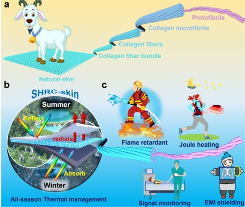 5. 團(tuán)隊(duì)報(bào)道了一種用于全季節(jié)可穿戴熱管理的具有三明治結(jié)構(gòu)的多功能 Janus天然皮膚。這種Janus型天然皮膚在無(wú)需額外能量輸入的情況下便可在冷卻和加熱模式之間自由轉(zhuǎn)換。此外,優(yōu)異的非對(duì)稱潤(rùn)濕性、阻燃性、導(dǎo)電性、焦耳加熱、電磁屏蔽干擾和生理信號(hào)監(jiān)測(cè)等多種附屬功能也極大程度增加了其對(duì)復(fù)雜環(huán)境的適應(yīng)性。在全季節(jié)可穿戴熱管理、低碳出行和節(jié)能建筑家具領(lǐng)域表現(xiàn)出廣闊的應(yīng)用潛力及前景。相關(guān)成果發(fā)表在Composites Part B(DOI: 10.1016/j.compositesb.2024.111573)上。陜西科技大學(xué)博士生謝龍為本論文的第一作者。通訊作者為陜西科技大學(xué)王學(xué)川教授、劉新華副教授、岳歐陽(yáng)博士后。