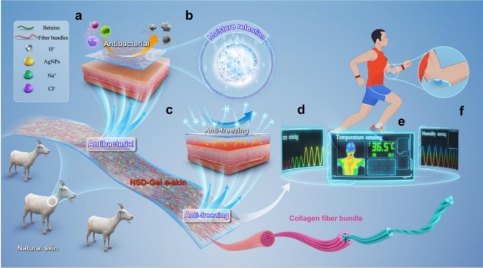 3. 團(tuán)隊(duì)采用簡(jiǎn)單的一鍋法,以天然皮膚為基材,并引入甜菜堿、銀納米粒子(AgNPs)、氯化鈉(NaCl)和甘油/水二元溶劑形成的混合液,以納米化方式設(shè)計(jì)了一種全新的多功能天然皮膚基有機(jī)水凝膠電子皮膚(NSD-Gel e-skin)。NSD-Gel e-skin顯示出良好的透明度以及優(yōu)異的拉伸強(qiáng)度(7.33 MPa)、抗穿刺性、保濕性、回濕性和抗菌性。此外,NSD-Gel e-skin具有優(yōu)異的耐寒/耐熱性和刺激反應(yīng)特性,可以有效地感知環(huán)境溫度或濕度的變化,以及監(jiān)測(cè)人體生理/運(yùn)動(dòng)信號(hào)。體外和體內(nèi)實(shí)驗(yàn)表明,NSD-Gel e-skin具有理想的生物相容性,即使在惡劣的環(huán)境中(-196℃至100℃)也能起到組織保護(hù)作用。NSD-Gel e-skin在可穿戴電子設(shè)備、人機(jī)界面和人工智能等領(lǐng)域具有巨大的應(yīng)用潛力,為開發(fā)具有按需特性的高性能電子皮膚提供了一個(gè)重要平臺(tái)。相關(guān)成果發(fā)表在Advanced Functional Materials(DOI: 10.1002/adfm.202212856)上。通訊作者為陜西科技大學(xué)王學(xué)川教授和劉新華副教授以及四川大學(xué)郭俊凌教授,博士研究生白忠薛為本論文的第一作者。
