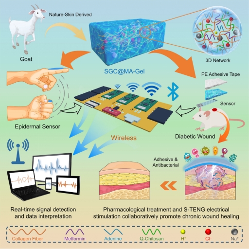 4. 團(tuán)隊(duì)利用天然皮膚基有機(jī)水凝膠制備了一種單電極摩擦納米發(fā)電機(jī),進(jìn)而開發(fā)出可用于慢性傷口治療的智能生物電子系統(tǒng)。該系統(tǒng)具有生物可吸收性、自供電和無(wú)線傳輸功能,可進(jìn)行持續(xù)性按需藥物治療、納米發(fā)電機(jī)自驅(qū)動(dòng)的傷口電刺激和可視化的實(shí)時(shí)傷口狀況評(píng)估。其中,天然皮膚衍生的有機(jī)水凝膠(SGC@MA-Gel)采用簡(jiǎn)單的一鍋法制備,主要由天然皮膚、甘油、季銨化殼聚糖、二甲雙胍和腺嘌呤組成。SGC@MA-Gel擁有天然皮膚的層級(jí)結(jié)構(gòu)和生物特性,具有膠原蛋白基生物材料的高負(fù)載能力,還具備理想的機(jī)械強(qiáng)度、粘附性、導(dǎo)電性、抗菌性、按需藥物釋放和人體生理信號(hào)監(jiān)測(cè)功能。該生物電子系統(tǒng)不僅可提供直接的按需藥物治療和納米發(fā)電機(jī)驅(qū)動(dòng)的傷口電刺激,以促進(jìn)皮膚傷口快速恢復(fù);還能夠?qū)崟r(shí)檢測(cè)傷口處的葡萄糖、尿酸和pH等生物標(biāo)志物,用于傷口可視化診斷和評(píng)估。相關(guān)成果發(fā)表在Nano Energy上。第一作者為白忠薛博士,通訊作者為王學(xué)川教授、劉新華副教授和四川大學(xué)陳一寧博士。