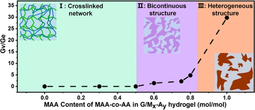 10. 團(tuán)隊(duì)張慧潔副教授等報(bào)道了通過(guò)氫鍵增強(qiáng)的明膠-丙烯酸共聚物水凝膠中的丙烯酸共聚物的甲基含量對(duì)水凝膠的結(jié)構(gòu)性能影響。研究表明,隨著甲基含量的增加,水凝膠的結(jié)構(gòu)逐漸由交聯(lián)的網(wǎng)絡(luò)結(jié)構(gòu)轉(zhuǎn)變?yōu)殡p連續(xù)相的相分離結(jié)構(gòu)以及多分散尺度的相分離結(jié)構(gòu)。含相同結(jié)構(gòu)的水凝膠具有相似的黏彈性行為。其中,含雙連續(xù)相的水凝膠具有最優(yōu)異的力學(xué)性能,其斷裂應(yīng)力可達(dá)近10 MPa,顯著高于其他已報(bào)道的明膠基水凝膠的力學(xué)強(qiáng)度。該成果發(fā)表在自然指數(shù)期刊Macromolecules, 2022, 55 (17), 7401-7410。