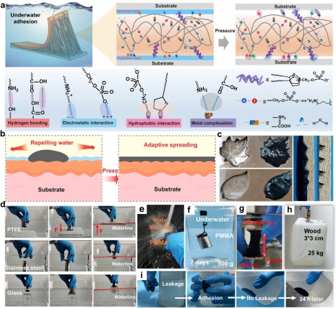 2. 團(tuán)隊(duì)設(shè)計(jì)了一種超分子組裝策略,以開發(fā)用于水下傳感/通信和泄漏密封的形狀自適應(yīng)多功能水下導(dǎo)電粘合劑(e-PT/GS)。憑借超分子相互作用,e-PT/GS表現(xiàn)出優(yōu)異的導(dǎo)電性、水下自修復(fù)能力、抗溶脹性能以及在各種惡劣環(huán)境(例如,酸、堿、海水和鹽溶液)中的持久粘附。E-PT/GS還表現(xiàn)出預(yù)期的形狀適應(yīng)性,能夠排斥界面水分并填補(bǔ)基底表面的不規(guī)則部分,從而與基底建立緊密且前所未有的適應(yīng)性接觸。結(jié)合無(wú)線設(shè)備,e-PT/GS被用于水下密封和現(xiàn)場(chǎng)實(shí)時(shí)監(jiān)測(cè)來(lái)自密封點(diǎn)的信號(hào),同時(shí)能夠?qū)崿F(xiàn)水下無(wú)線通信,并收集穩(wěn)定的ECG信號(hào)。相關(guān)成果發(fā)表在Nano Today(DOI:10.1016/j.nantod.2024.102282)上。通訊作者為陜西科技大學(xué)王學(xué)川教授、劉新華副教授,博士生鄒曉亮為本論文的主要完成人及第一作者。