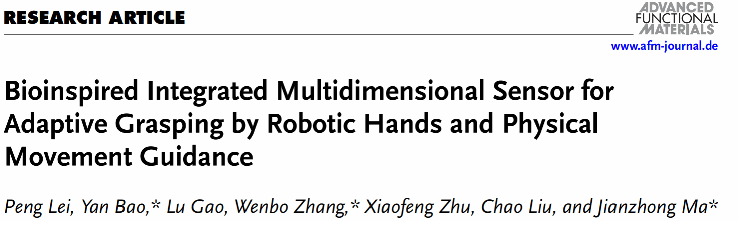 相關(guān)成果以“Bioinspired Integrated Multidimensional Sensor for Adaptive Grasping by Robotic Hands and Physical Movement Guidance”為題,發(fā)表在Advanced Functional Materials(IF = 18.5)上。陜西科技大學(xué)為論文唯一通訊單位,輕工學(xué)院2019級(jí)博士研究生雷鵬為該論文的第一作者,輕工學(xué)院馬建中教授、鮑艷教授和張文博副教授為論文共同通訊作者。