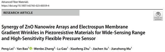 相關(guān)成果以“Synergy of ZnO Nanowire Arrays and Electrospun Membrane Gradient Wrinkles in Piezoresistive Materials for Wide-Sensing Range and High-Sensitivity Flexible Pressure Sensor”為題,發(fā)表在Advanced Fiber Materials(IF = 17.2)上。陜西科技大學(xué)為論文唯一通訊單位,輕工學(xué)院2019級(jí)博士研究生雷鵬為該論文的第一作者,輕工學(xué)院馬建中教授、鮑艷教授和張文博副教授為論文共同通訊作者。