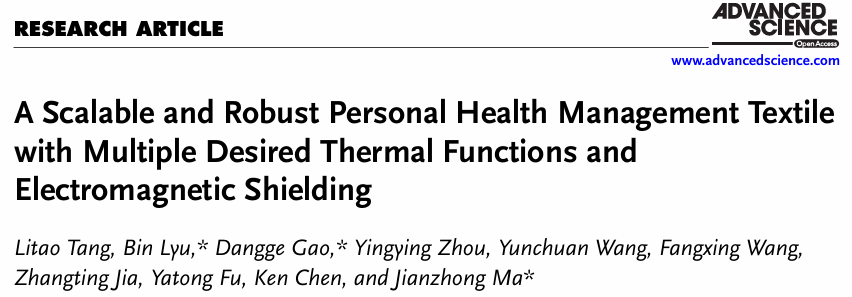 相關(guān)成果以“A Scalable and Robust Personal Health Management Textile with Multiple Desired Thermal Functions and Electromagnetic Shielding”為題,發(fā)表在Advanced Science(IF = 14.3)上。陜西科技大學(xué)為論文唯一通訊單位,論文第一作者為輕工學(xué)院2020級(jí)博士研究生唐立濤,輕工學(xué)院馬建中教授、呂斌教授和高黨鴿教授為論文共同通訊作者。