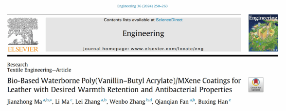 相關(guān)成果以“Bio-Based Waterborne Poly(Vanillin-Butyl Acrylate)/MXene Coatings for Leather with Desired Warmth Retention and Antibacterial Properties”為題,發(fā)表在中國(guó)工程院院刊《Engineering》(IF=10.1)上。陜西科技大學(xué)為論文唯一通訊單位,輕工學(xué)院馬建中教授為該論文的第一作者和唯一通訊作者。