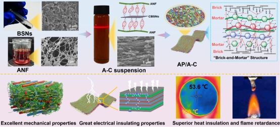 團(tuán)隊(duì)提出了一種仿貽貝結(jié)構(gòu)的復(fù)合芳綸紙概念,通過(guò)將羰基化改性的玄武巖納米片植入芳綸納米纖維(ANF)的三維網(wǎng)狀結(jié)構(gòu)中構(gòu)建仿貽貝層狀結(jié)構(gòu),然后通過(guò)浸漬法將其填充至芳綸紙(AP)的多孔結(jié)構(gòu)中形成復(fù)合紙(AP/ANF-CBSNs),制得的AP/ANF-CBSNs復(fù)合紙的內(nèi)部和表面形成了仿貽貝層狀結(jié)構(gòu),使其具有優(yōu)異的機(jī)械性能、絕緣性能、耐久性、隔熱性和顯著的阻燃性。仿珍珠母結(jié)構(gòu)和浸漬策略為開(kāi)發(fā)先進(jìn)的電絕緣紙材料提供了一種有效途徑,適用于高頻率和高電壓電氣工程設(shè)備。研究成果以“Nacre-inspired composite papers with enhanced mechanical and electrical insulating properties: Assembly of aramid papers with aramid nanofibers and basalt nanosheets”發(fā)表在《Journal of Materials Science & Technology》上。博士研究生戢德賢為本研究的主要完成人,宋順喜副教授、張美云教授、倪永浩教授為通訊作者。