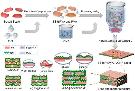 團(tuán)隊(duì)利用纖維素納米纖絲(CNF)、聚乙烯醇(PVA)和玄武巖鱗片(BS)為原料,通過(guò)真空輔助自組裝法,制備了具有優(yōu)異機(jī)械強(qiáng)度、電絕緣性和抗紫外線性能的層狀復(fù)合紙,通過(guò)預(yù)混聚PVA與BS,促進(jìn)了BS與CNF之間的界面結(jié)合力。同時(shí),未吸附的PVA增加了混合溶液的粘度,防止了CNF絮凝,進(jìn)一步增強(qiáng)了材料的均勻性和分散性,這種層狀結(jié)構(gòu)顯著提高了復(fù)合紙的機(jī)械性能、電絕緣性能和抗紫外老化性能。研究成果以“Nacre-inspired composite paper of PVA crosslinked basalt scale and nanocellulose with enhanced mechanical, electrical insulating and ultraviolet-resistant aging performance”發(fā)表在《International Journal of Biological Macromolecules》上。碩士吳琪為本研究的主要完成人,宋順喜副教授、張美云教授為通訊作者。
