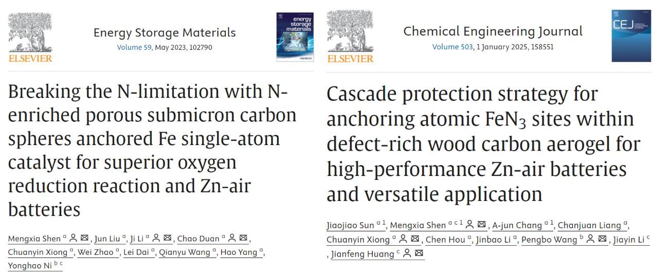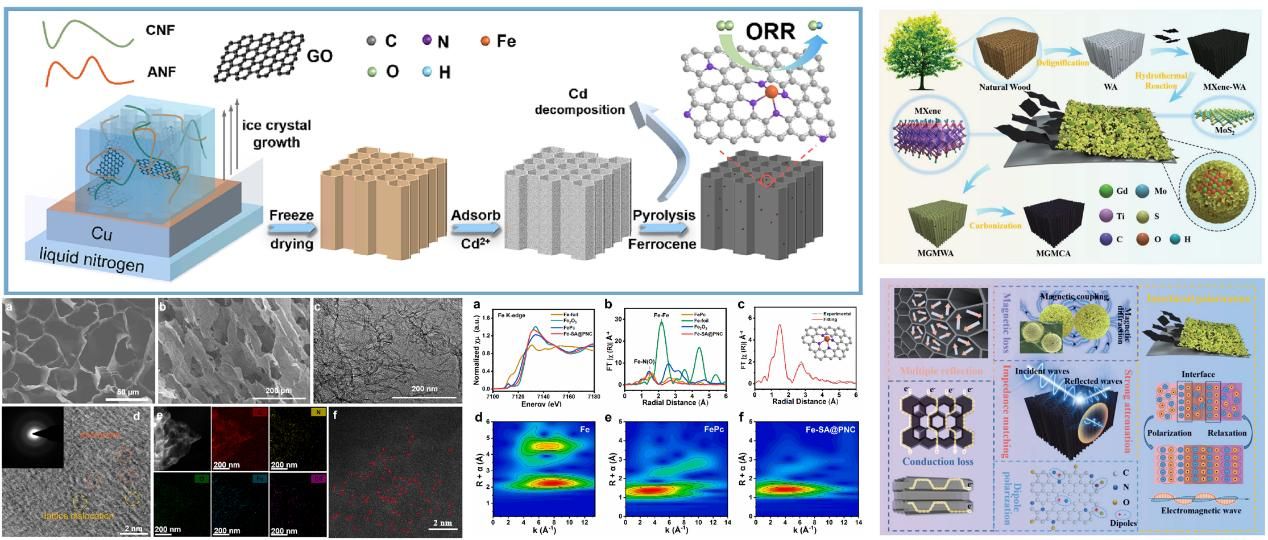 沈夢霞副教授課題組以木質(zhì)纖維等生物質(zhì)通過金屬交聯(lián)、活性物質(zhì)和熱犧牲金屬模板引入等策略,制備了一系列基于納米纖維素的氣凝膠體系,并通過對碳?xì)饽z微結(jié)構(gòu)中金屬活性位點(diǎn)優(yōu)化篩選、孔結(jié)構(gòu)和碳質(zhì)缺陷等精細(xì)調(diào)控,構(gòu)建了系列碳載金屬單原子催化劑,實(shí)現(xiàn)了高性能鋅空氣電池應(yīng)用。相關(guān)研究成果發(fā)表在Energy Storage Materials, Chemical Engineering Journal, Journal of Colloid and Interface Science等期刊。此外,利用改性木材氣凝膠的定向多孔結(jié)構(gòu)負(fù)載具有高介電常數(shù)的MXene和磁性稀土氧化物Gd2O3,并結(jié)合MoS2納米片以形成多重異質(zhì)界面,制備了具有磁-介電協(xié)同和多層結(jié)構(gòu)的MoS2@Gd2O3/Mxene多孔碳?xì)饽z復(fù)合材料,實(shí)現(xiàn)阻抗匹配和多重電磁波損耗機(jī)制,該木材衍生材料展現(xiàn)出優(yōu)異的電磁波吸收性能(Small 2024, 2306915)。其中有5篇論文入選ESI高被引論文,部分文章鏈接:https://doi.org/10.1016/j.ensm.2023.102790,https://doi.org/10.1002/smll.202306915,https://doi.org/10.1016/j.cej.2024.158551。