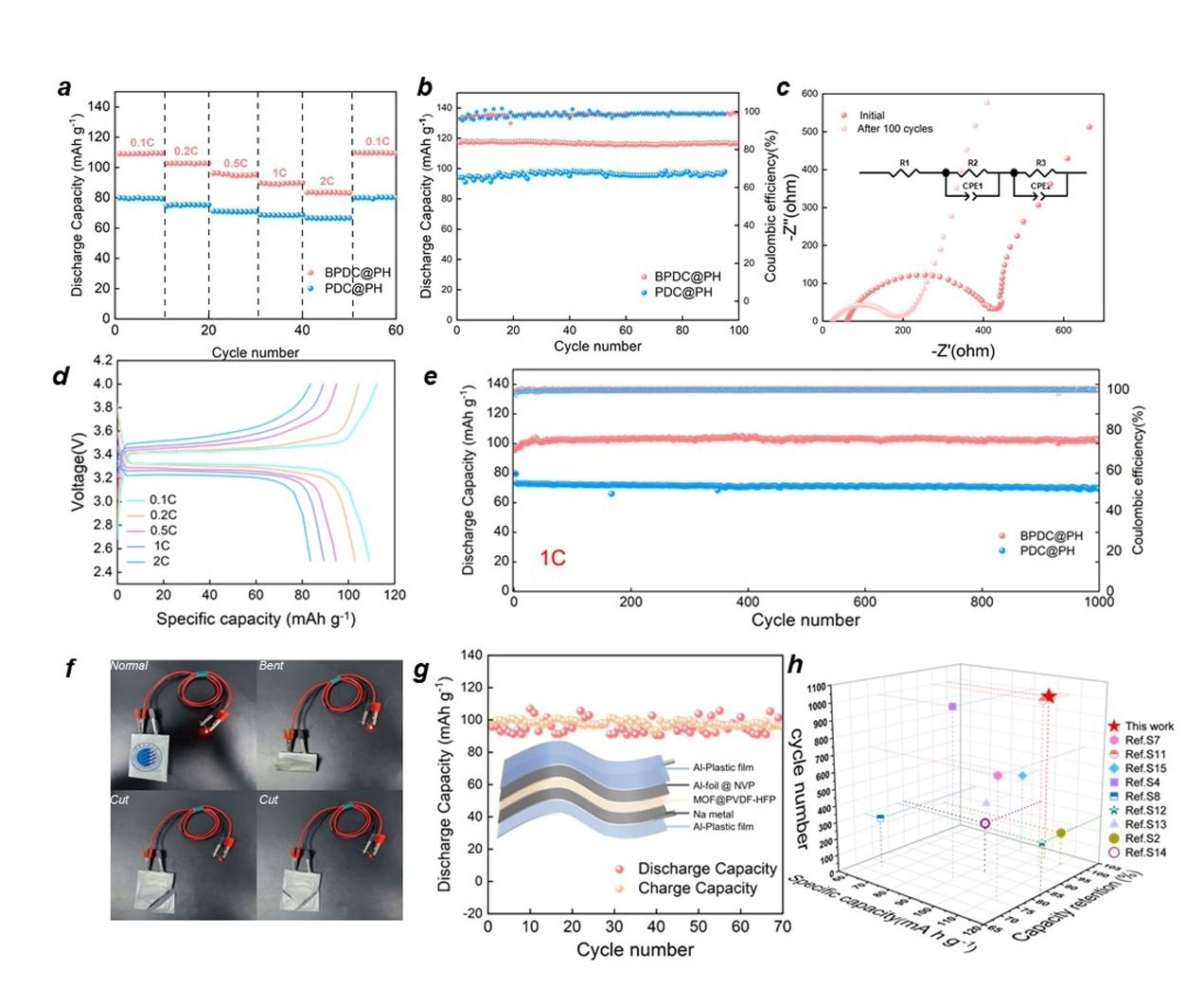 2. 超長循環(huán)穩(wěn)定性與界面優(yōu)化。在1.0 mA cm?2電流密度下,鈉金屬對稱電池連續(xù)運行超1000小時無短路,全電池(NVP|BPDC@PH|Na)循環(huán)1000次后容量保持率高達98%。分子動力學模擬顯示,擴大的MOF孔道加速了NaTFSI的傳輸,促進負極表面形成富含NaF的薄層固態(tài)電解質(zhì)界面(SEI),有效抑制枝晶生長。組裝的固態(tài)軟包電池在彎折、切割等極端條件下仍可穩(wěn)定供電,并點亮LED燈組,展現(xiàn)出優(yōu)異的機械安全性和商業(yè)化潛力。