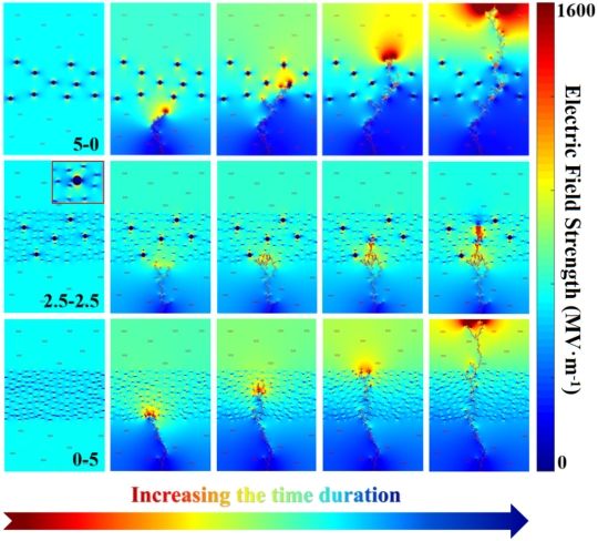 圖3 三明治結(jié)構(gòu)PEI基復(fù)合材料的電樹枝動態(tài)演化模擬圖